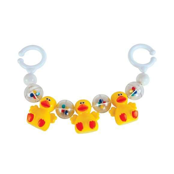 Эту подвеску можно закрепить на детской кроватке или на коляске с помощью специальных колечек. Если покачать подвеску, она будет весело греметь. Сначала малыш научится фокусировать взгляд на разноцветных игрушках, а потом начнет тянуться к подвеске ручками и ножками. Такое изделие послужит крохе хорошим тренажером для развития тактильных ощущений, слухового и зрительного восприятия, а также внимания и способности различать цвета. Подвеска состоит из четырех прозрачных шаров с яркими мини-шариками внутри и трех фигурок симпатичных утят. Размер вместе с кольцами: 30х5,5 см. Рекомендованный возраст 0 мес. + Изделие изготовлено из пластика.