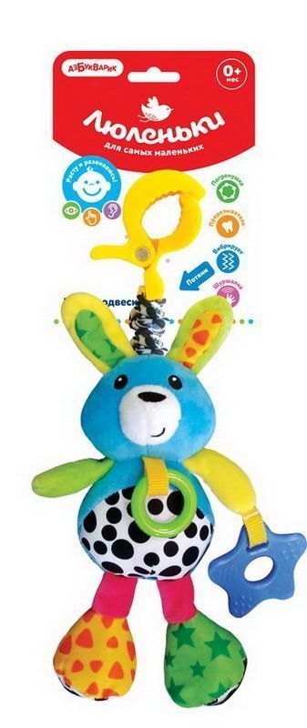 Игрушка-сюрприз для самых маленьких – с вибромеханизмом! Потяни зайчонка за ножки, отпусти – он будет двигаться, как живой! В ушках у зайчика – шуршалки, в животике – погремушка, а в лапке он «держит» прорезыватель для первых детских зубиков. Прищепка удобно крепится на кроватку или коляску.