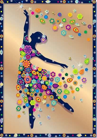Картина-коллаж из стильных стикеров на затемнённом полупрозрачном фоне «Балерина» понравится ребёнку старше 8 лет: он легко наклеит на пластик части рамки и точёный силуэт танцующей балерины, а затем украсит изображение узорными и блестящими стикерами, будто бы слетающими с силуэта. Особенно эффектно картина смотрится на фоне узора обоев, который слегка просвечивает сквозь полупрозрачный пластик кофейного оттенка. А в рамке из багета картина-коллаж превратится в настоящий шедевр и станет ярким акцентом в любом интерьере!
