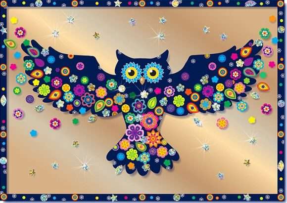 Картина-коллаж из стильных стикеров на затемнённом полупрозрачном фоне «Филин» понравится ребёнку старше 8 лет: он легко наклеит на пластик части рамки и силуэт взмахнувшего могучими крыльями филина, а затем украсит изображение узорными и блестящими стикерами. Особенно эффектно картина смотрится на фоне узора обоев, который слегка просвечивает сквозь полупрозрачный пластик кофейного оттенка. А в рамке из багета картина-коллаж превратится в настоящий шедевр и станет ярким акцентом в любом интерьере!