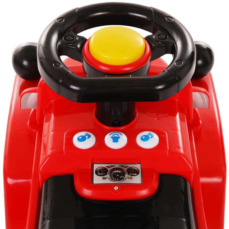 Машинка выполнена таким образом, чтобы быть максимально безопасной для малыша. У нее отсутствуют острые углы. Есть поворотный руль с кнопкой-пищалкой, звуковые и световые эффекты. У джипа (под сидением) имеется багажник для игрушек.