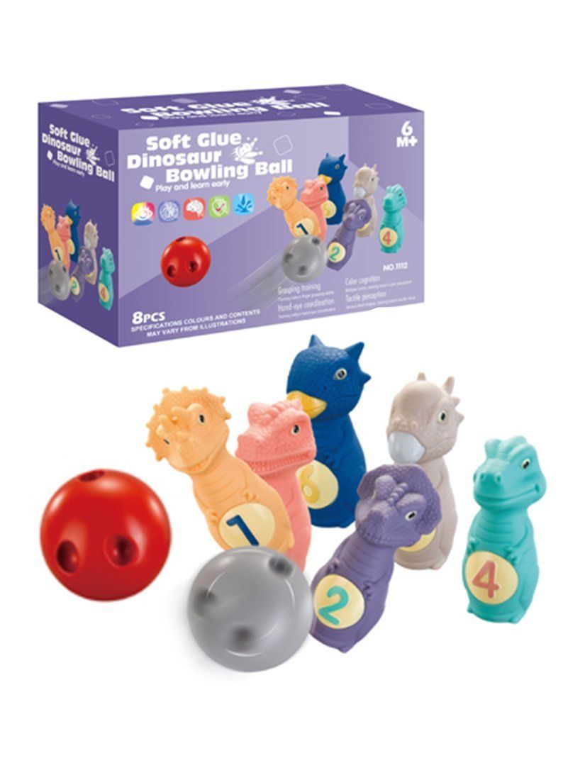 С детским боулингом «Дино» не соскучится никто! Игровой набор включает 6 резиновых кеглей, выполненных в виде забавных динозавриков, и 2 мяча с выемками для пальцев. Мячи имеют небольшой вес и размер: ребенку будет удобно их держать в руке.