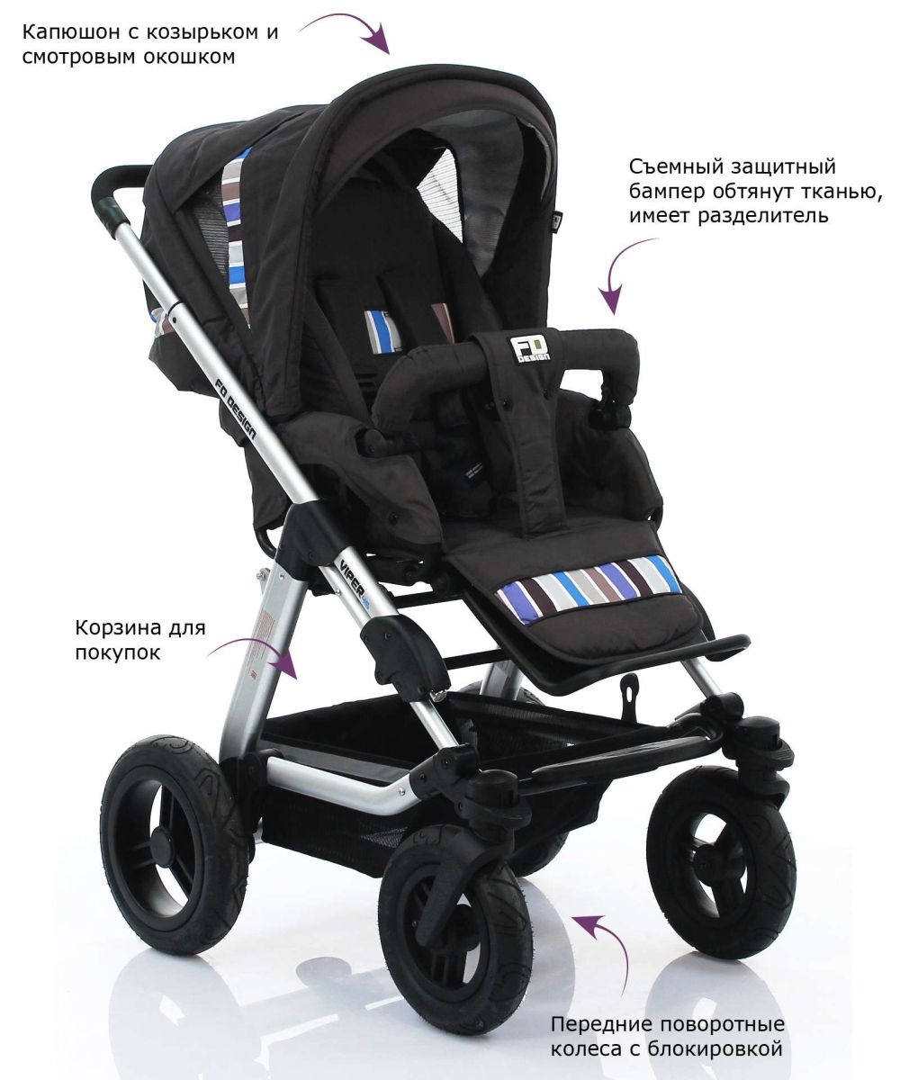 Если Вы активная мамочка и хотите гулять с Вашим ребенком везде: и в парке, и на даче, и в городе, и по сугробам, то FD-Design Viper, несомненно, Вам отлично подойдет. Надувные колеса не только обеспечивают мягкий и плавный ход, но и помогают преодолевать любые препятствия. Передние колеса без труда блокируются - и перед Вами уже настоящий "внедорожник", способный на любые прогулки.