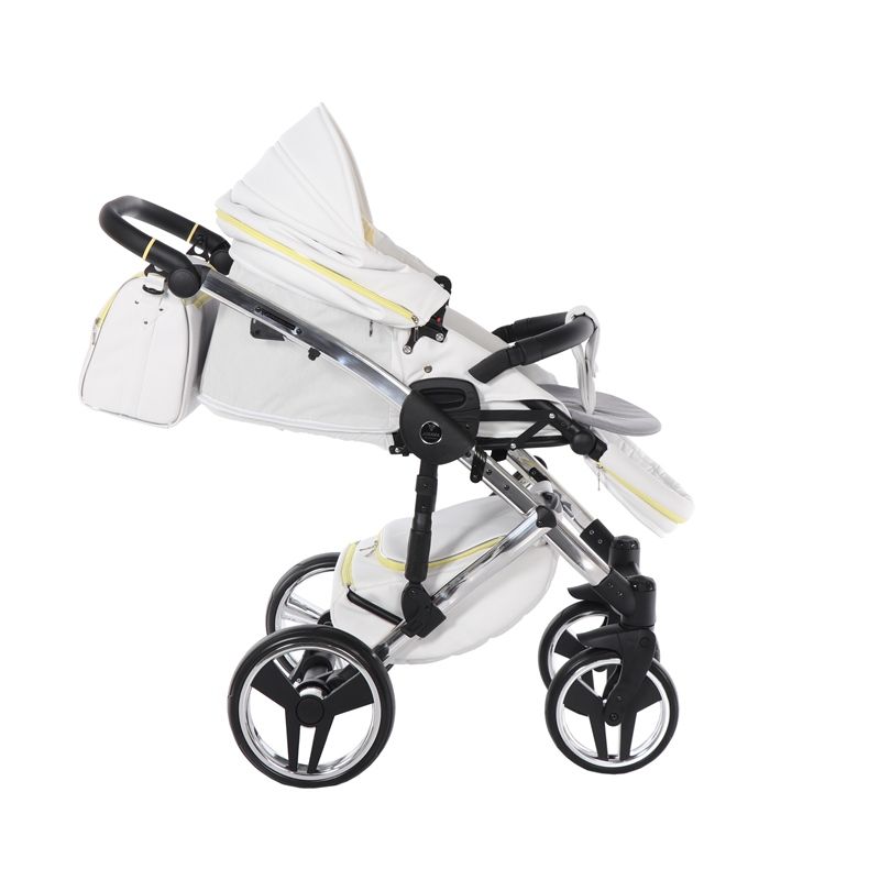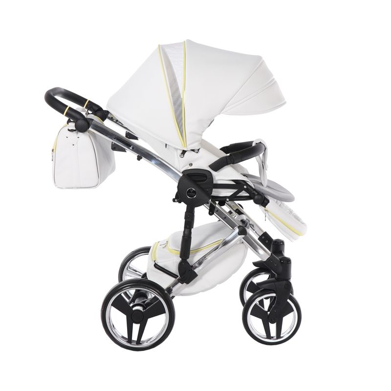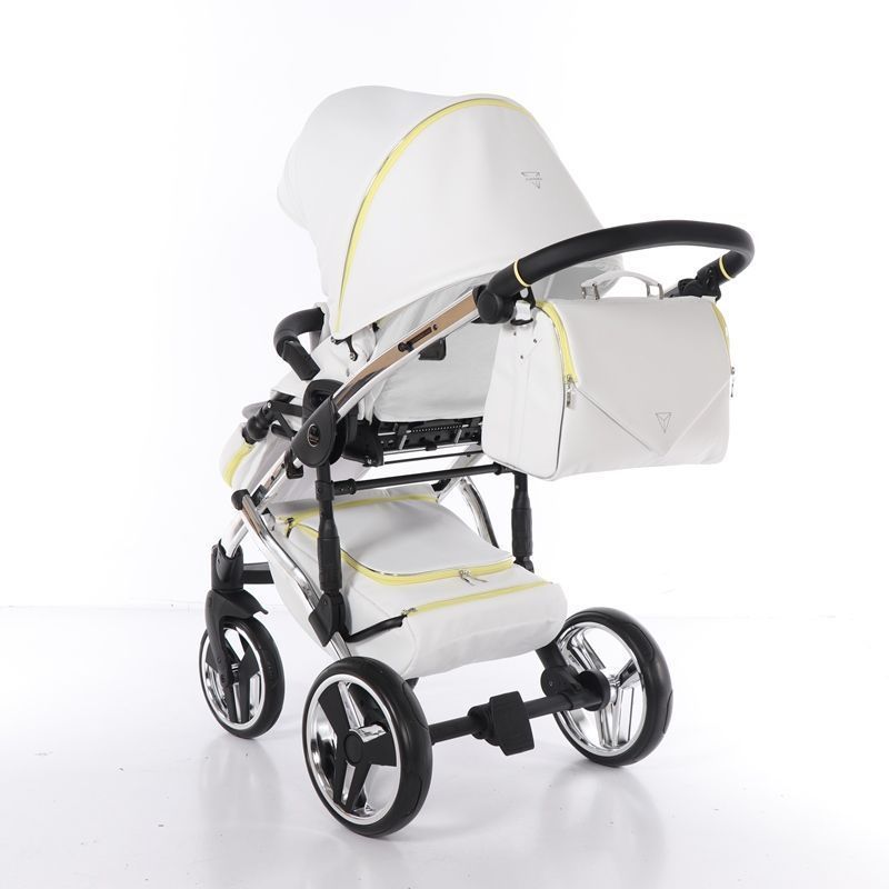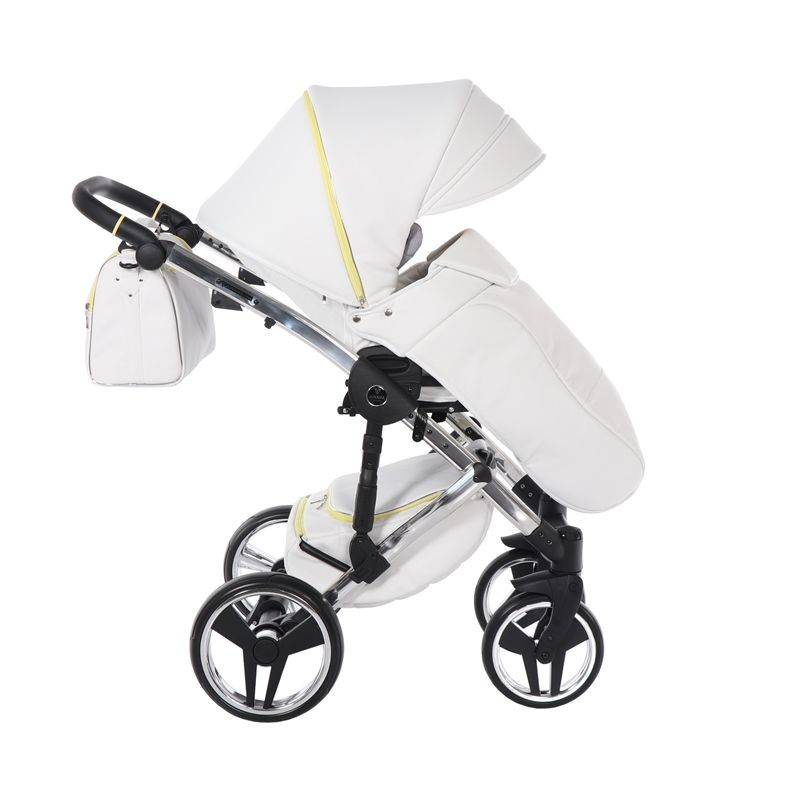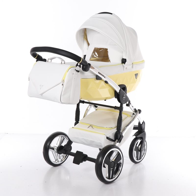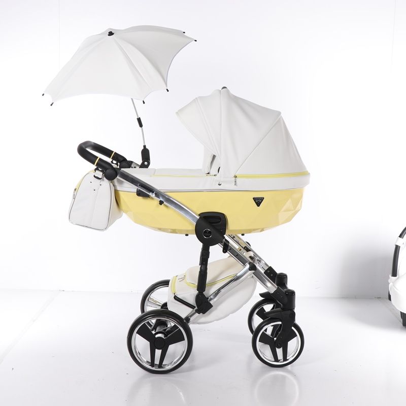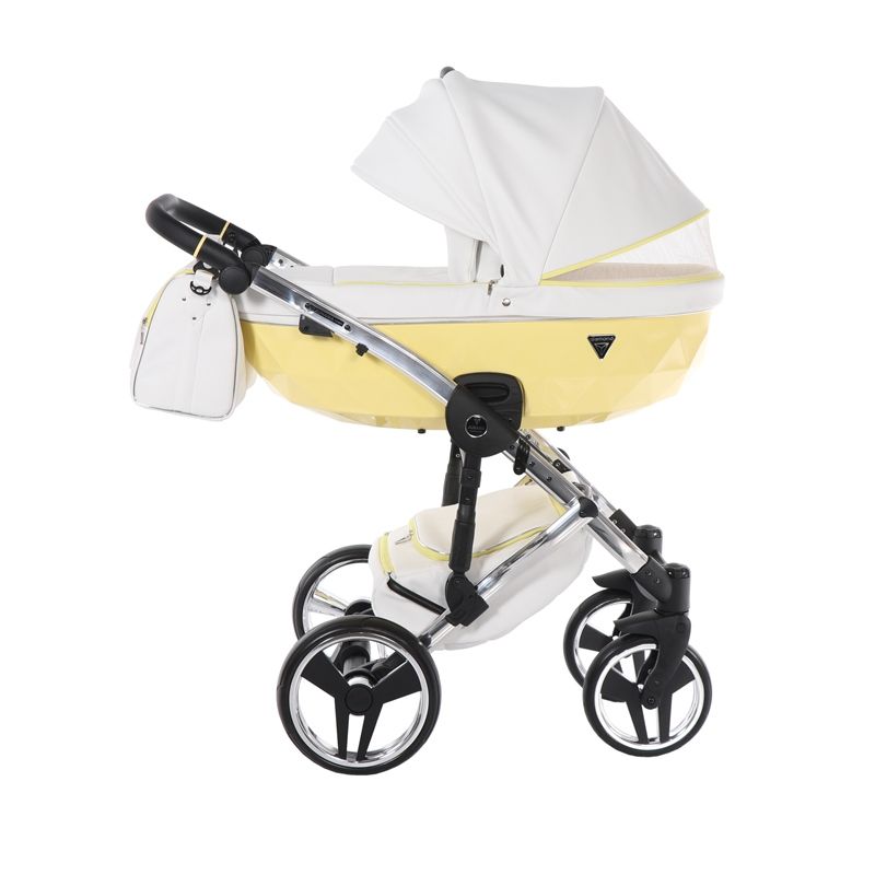Бриллиантовый короб коляски Junama Candy напоминает вкусный, сладкий, сливочный леденец. А блестящая и придающая элегантный стиль хромированная рама создает нежный образ коляски.