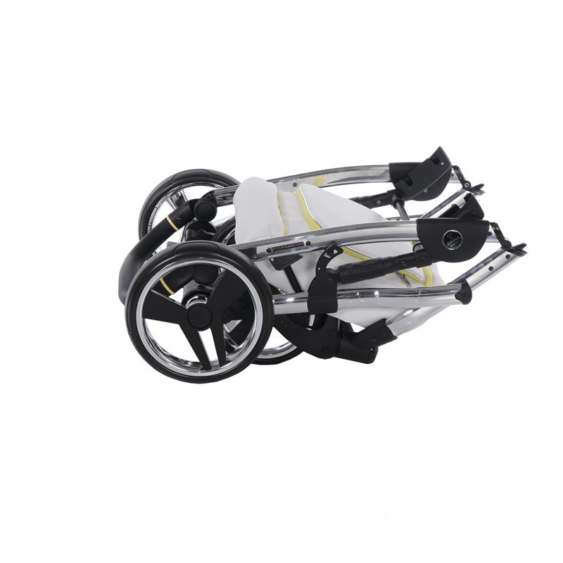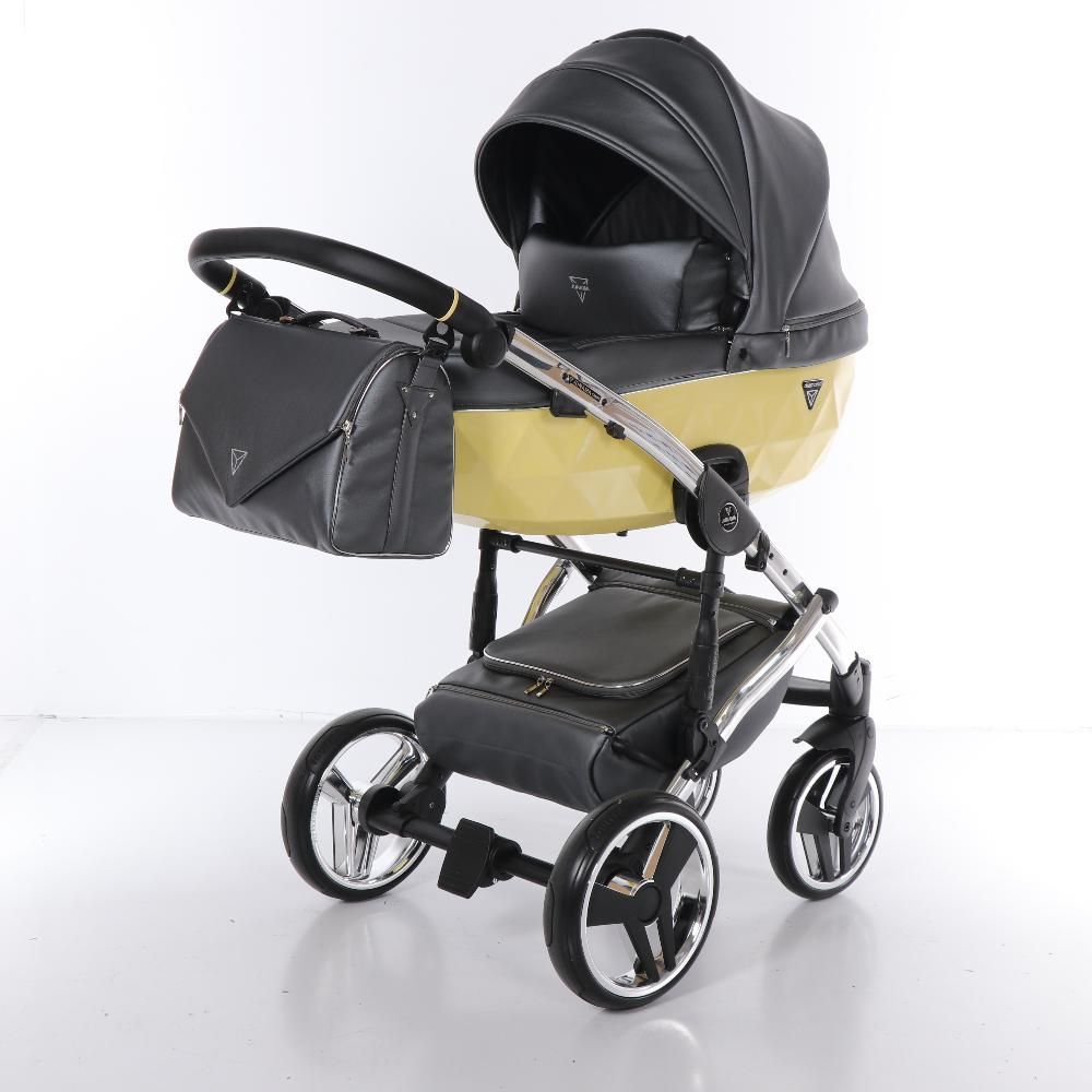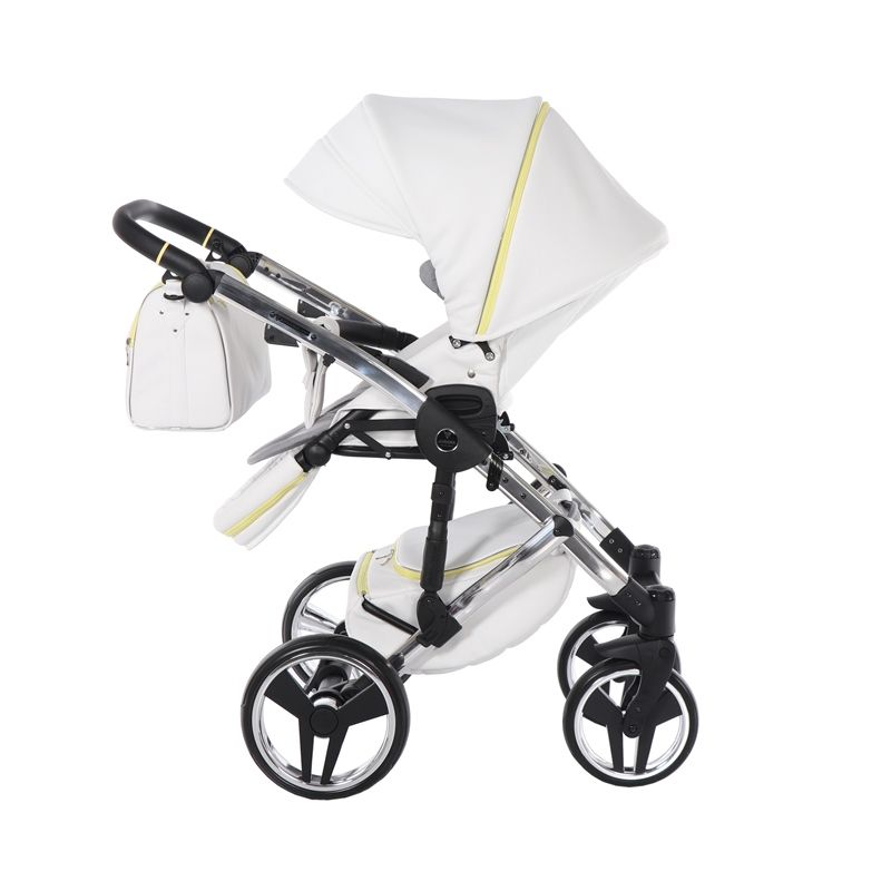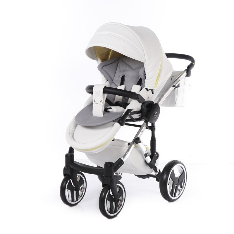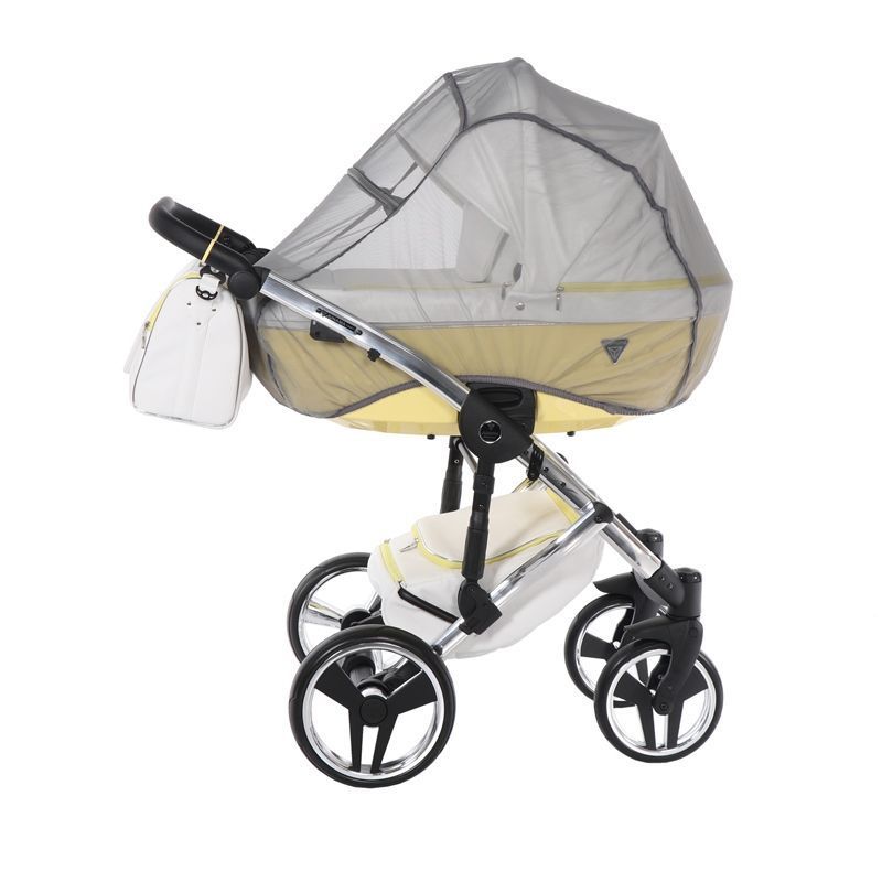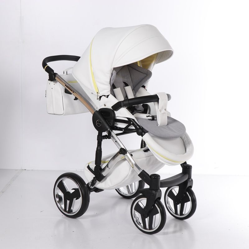 Бриллиантовый короб коляски Junama Candy напоминает вкусный, сладкий, сливочный леденец. А блестящая и придающая элегантный стиль хромированная рама создает нежный образ коляски.