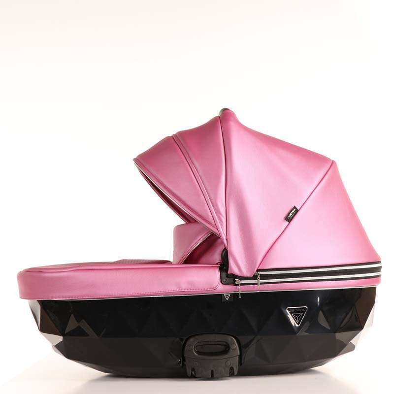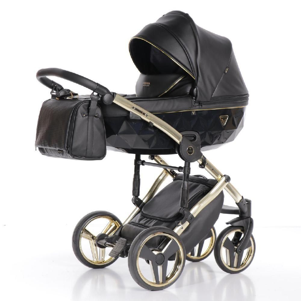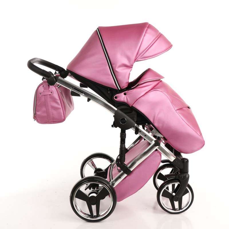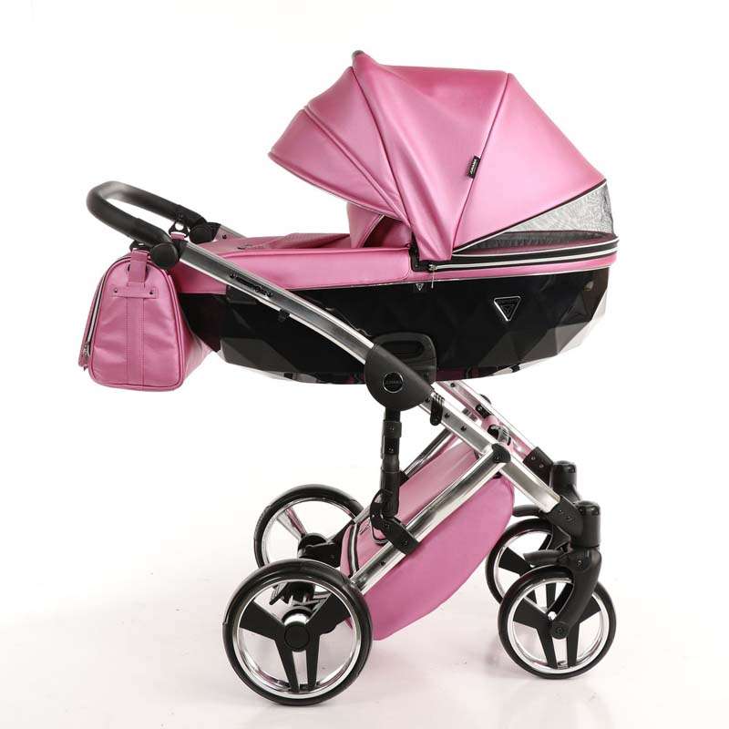 Современные технологии в коляске FLUO LINE удивительным образом сочетаются с элегантностью оформления. Люлька выполнена полностью из полированного пластика в форме бриллианта, который не просто прекрасно смотрится но и защищает малыша от любого ветра, а капюшон и накидка из экокожи отделаны золотом или серебром в цвет рамы коляски.