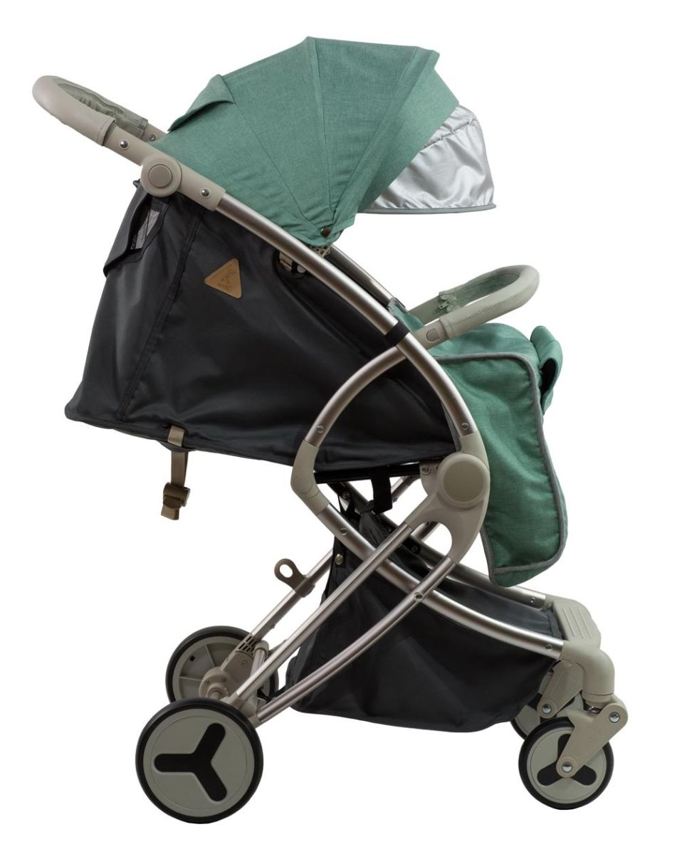 Рама алюминиевая с системой амортизации. 3 положения спинки: сидя, полулёжа и лёжа. Капюшон XXL со светоотражающей вставкой. Передние колёса поворотные и съёмные, задние колёса съёмные с системой блокировки. Легкое складывание рамы. Вес 7,2 кг. В комплект входят: полог для ног, вместительная корзина для продуктов, москитная сетка, дождевик.