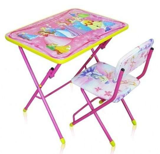 Набор складной детской мебели «Маленькая Принцесса» с металлическим каркасом подойдёт и для игр, и для обучения. На ламинированной поверхности столешницы нанесены красочные рисунки, а ещё на ней можно рисовать маркером на водной основе. На ножках стола и стула имеются пластиковые наконечники. На стульчике предусмотрена подставка для ног.