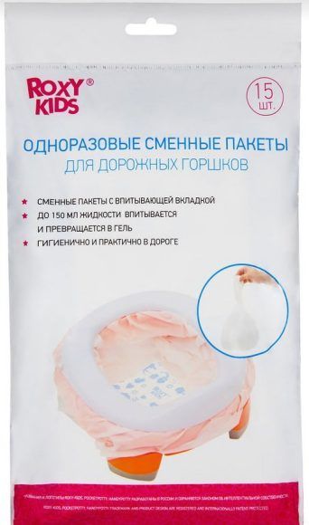 Сменные одноразовые пакеты для горшков производителя Roxy-Kids необычайно просты и удобны в применении. Благодаря тому, что пакеты имеют небольшую форму, их можно положить в сумку. Сменные пакеты изготовлены из специального непромокаемого материала, быстро впитывают, превращая жидкость в гель. В одной упаковке Roxy-Kids 15 сменных пакетов. Данный набор просто незаменим при длительных прогулках и путешествиях.