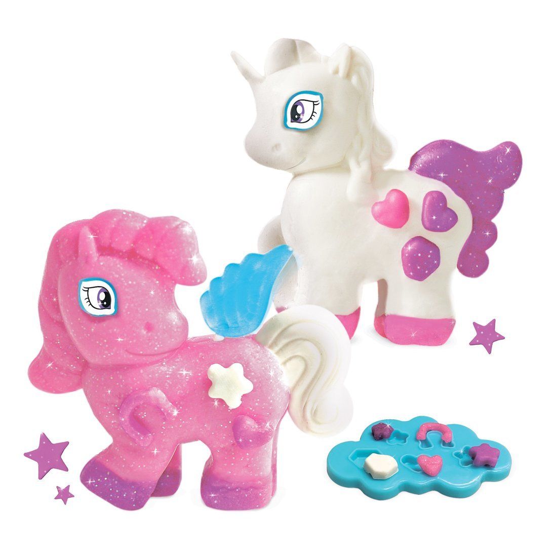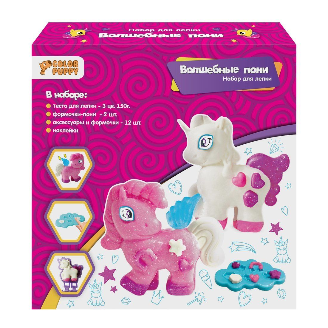 «Волшебные пони» – это увлекательный набор для детского творчества, с помощью которого можно слепить двух прекрасных сказочных лошадок! Для этого в комплекте имеются специальные формочки. Слепив фигурки пони, ребёнок сможет украсить их дополнительными элементами, которые сделает при помощи формы-облачка. В завершение на фигурки нужно будет прикрепить пластиковые основы с наклеенными глазками и крылышки. Волшебные пони готовы!
