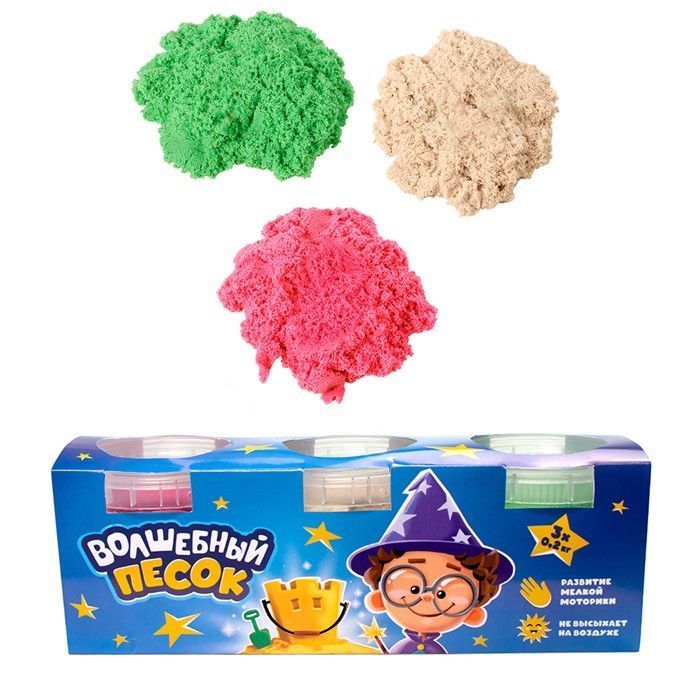 Яркий микс цветов для интересных игр. Волшебный песок увлечет Вашего Малыша на длительное время. Песок отлично лепится и держит форму. Создавайте песочные замки, закапывайте и ищите сокровища, рисуйте на песке и придумывайте новые игры снова и снова! Особая, воздушная структура песка позволяет прочувствовать каждую песчинку. Идеально подходит для развития мелкой моторики. Песок не высыхает на открытом воздухе. Подарите Вашему ребенку возможность творить, ведь Дети, так сильно любят песок!
