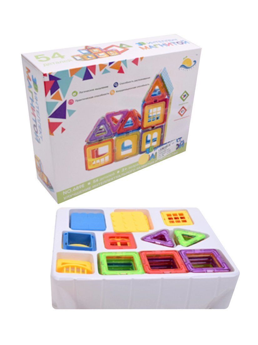конструкторе 54 элемента: 34 магнитных детали, 20 пластиковых элементов.