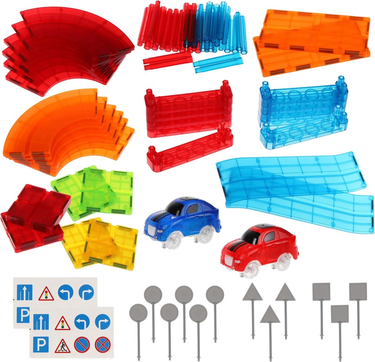 Комплектация: 28 магнитных деталей, 30 пластиковых деталей, 2 машинки, 12 дорожных знаков, 3 листа с наклейками.