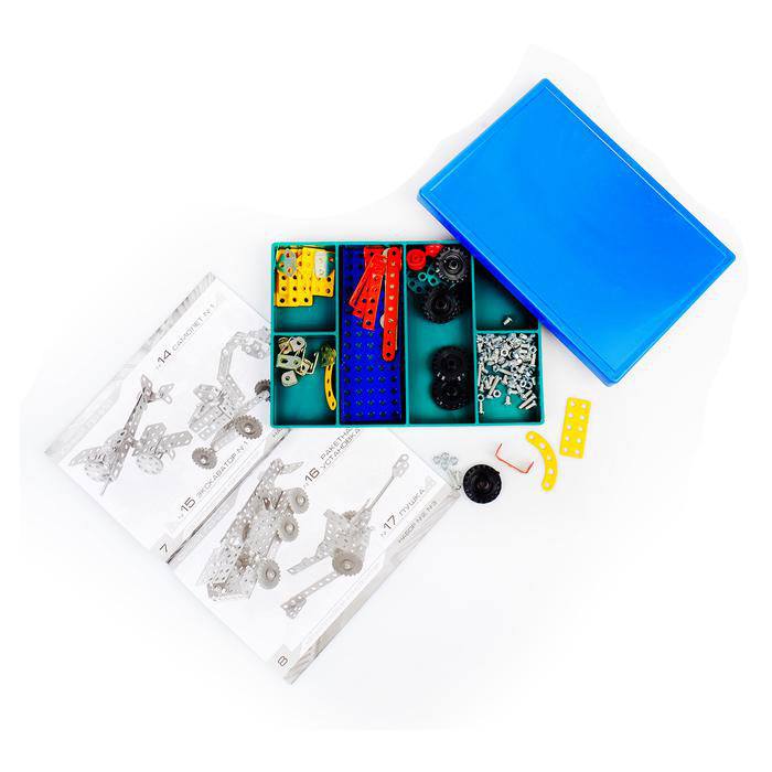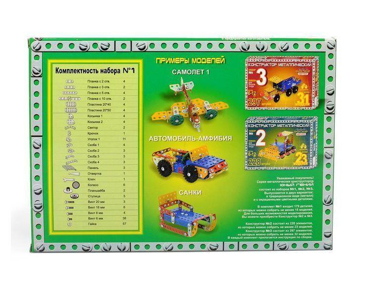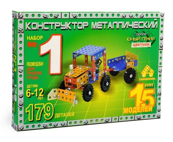 Набор №1 из серии "Юный гений" - это конструктор, состоящий из 179 цветных деталей для сборки. С его помощью юный конструктор может соорудить более 15 моделей различной техники.