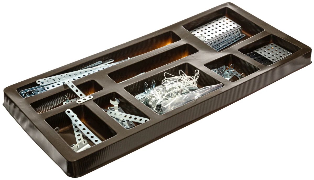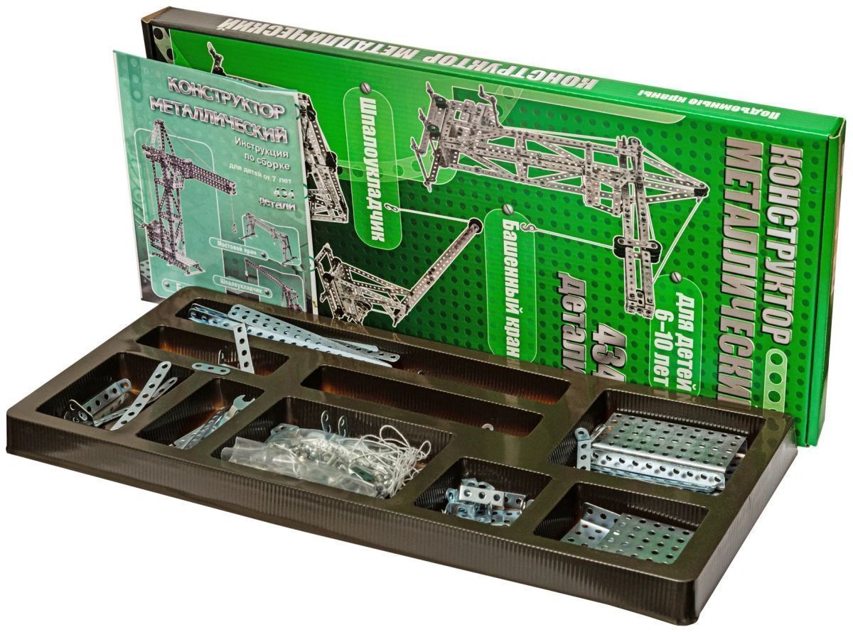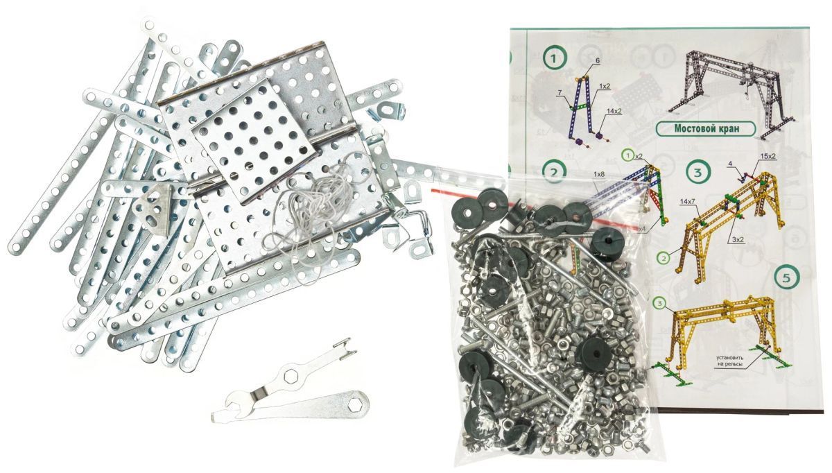 Конструктор выполнен из качественного металла, что гарантирует его долговечность и безопасность для детей. В комплекте 434 детали, что позволяет собрать три модели: башенный кран, шпалоукладчик и мостовой кран.