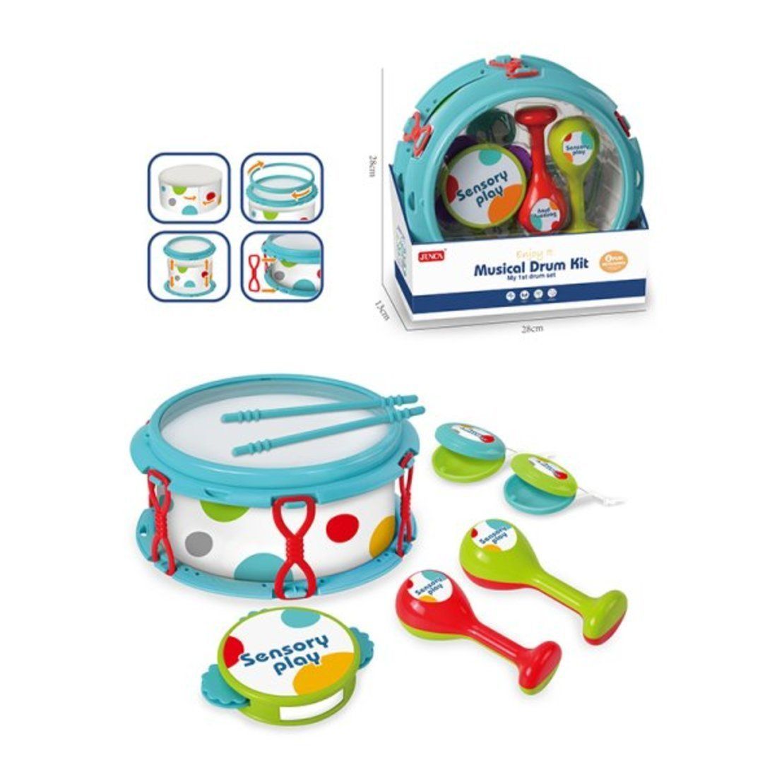 Набор музыкальных инструментов включает 1 барабан, 2 палочки, 2 маракаса, 1 бубен и 2 кастаньеты.