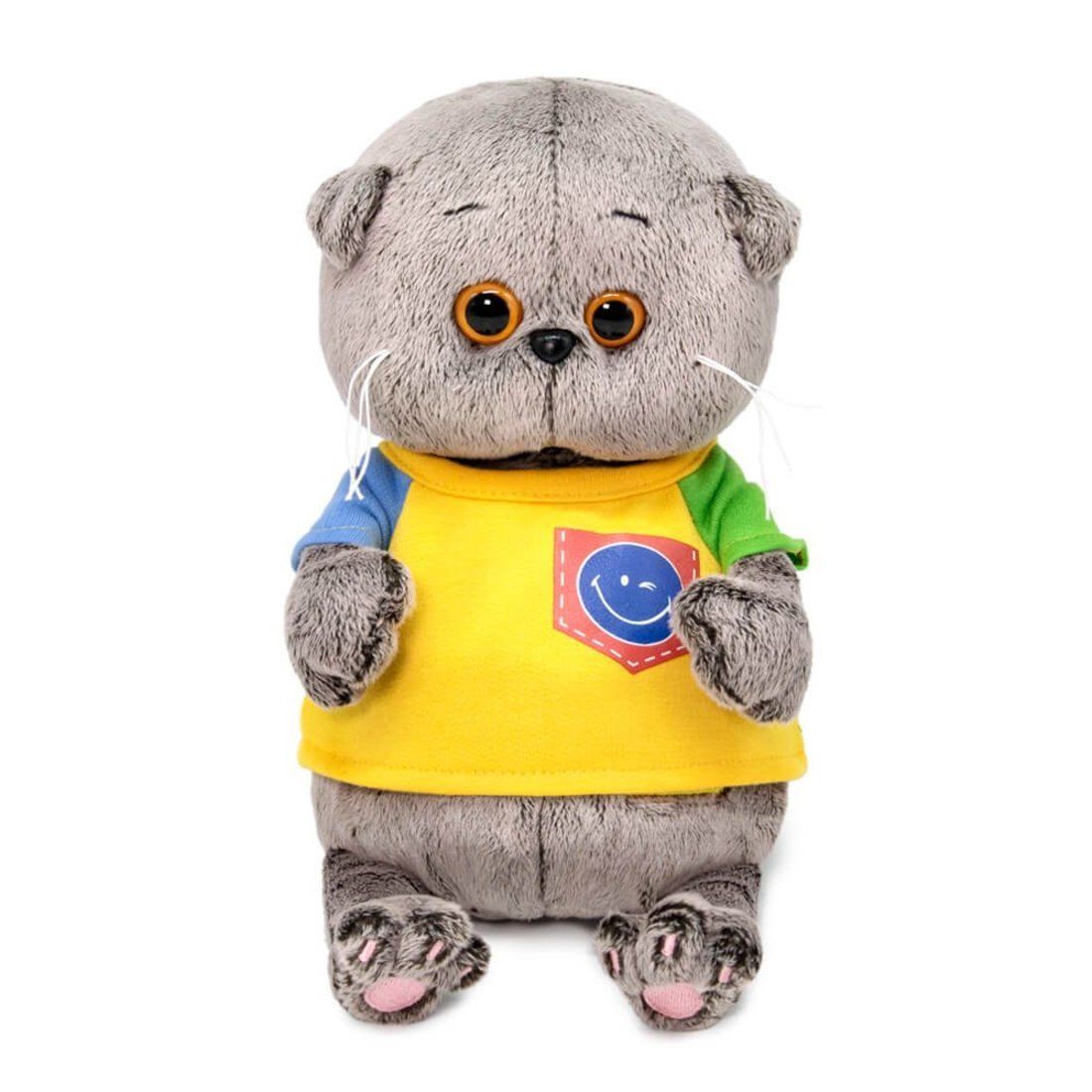 Малыш Басик в трогательной желтой футболочке с разноцветными рукавами. Спереди футболку украшает термонаклейка в виде кармашка со смайликом. Мягкая игрушка поставляется в закрытой подарочной коробке.