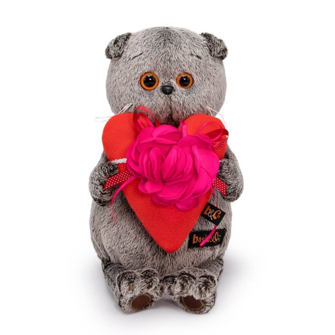 Басик держит в лапках мягкое сердечко из алого флиса. Сердечко украшено кружевной лентой, большим ярко-розовым цветком из шёлка и атласными лентами. Игрушка поставляется в закрытой подарочной коробке, подвязанной атласными лентами.