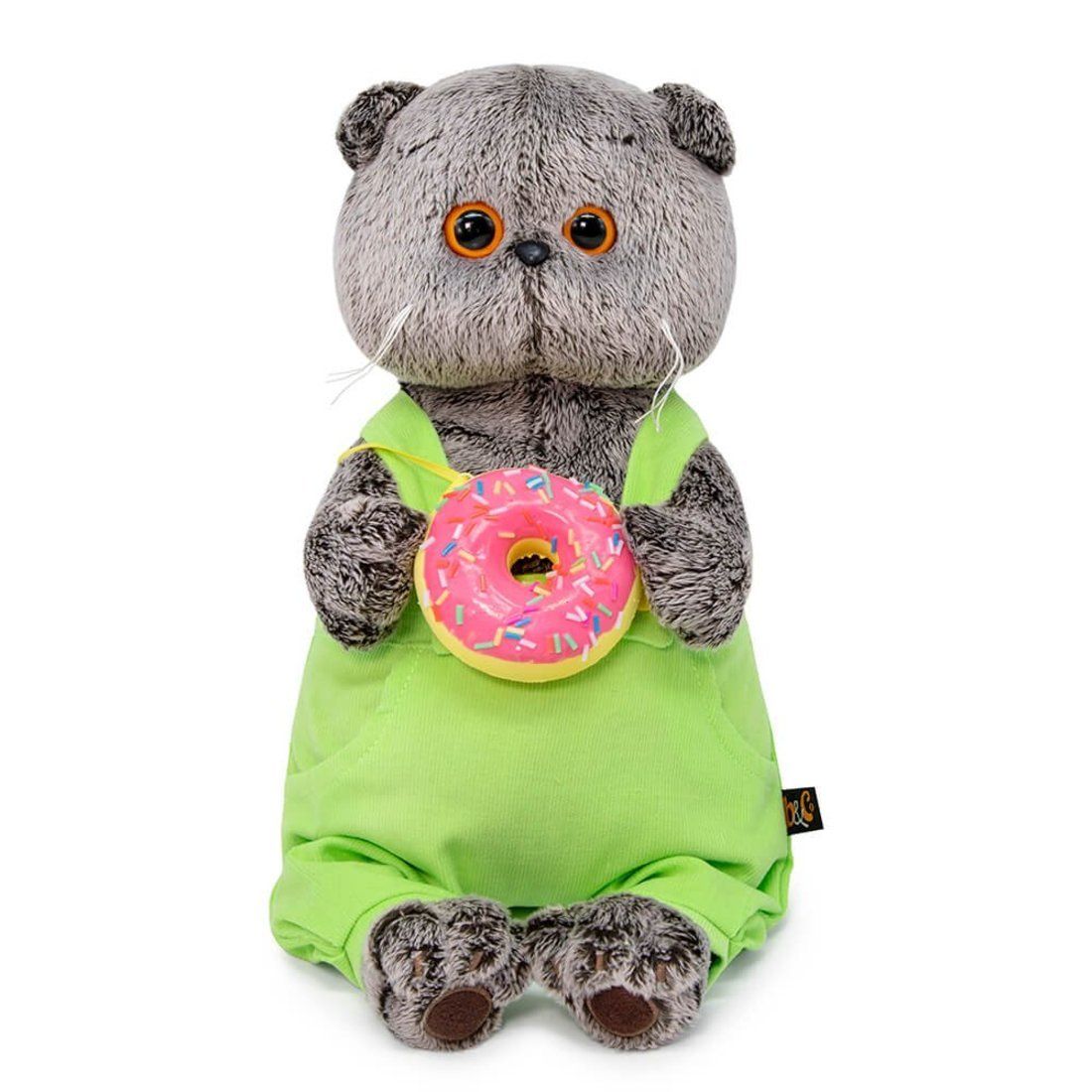 Кот Басик в комбинезоне из микровельвета цвета свежего салата. В лапках Басик держит интересный аксессуар‑антистресс в виде аппетитного пончика. Игрушка поставляется в закрытой подарочной коробке, подвязанной атласными лентами.