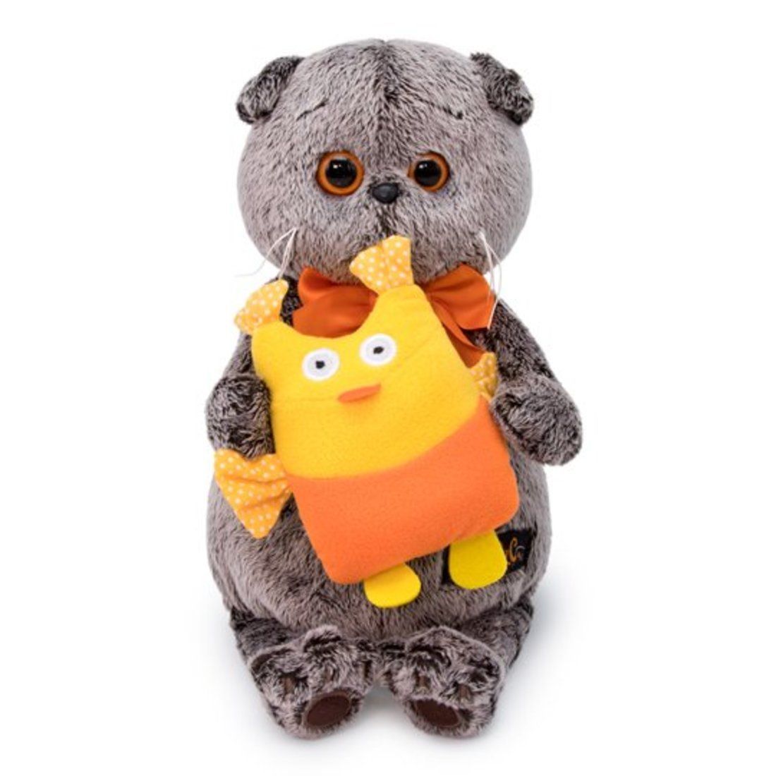 Басик держит в лапках забавную игрушку – жёлтенькую сову, сшитую из флиса. Также на Басике оранжевый галстук бабочка. Игрушка поставляется в закрытой подарочной коробке.