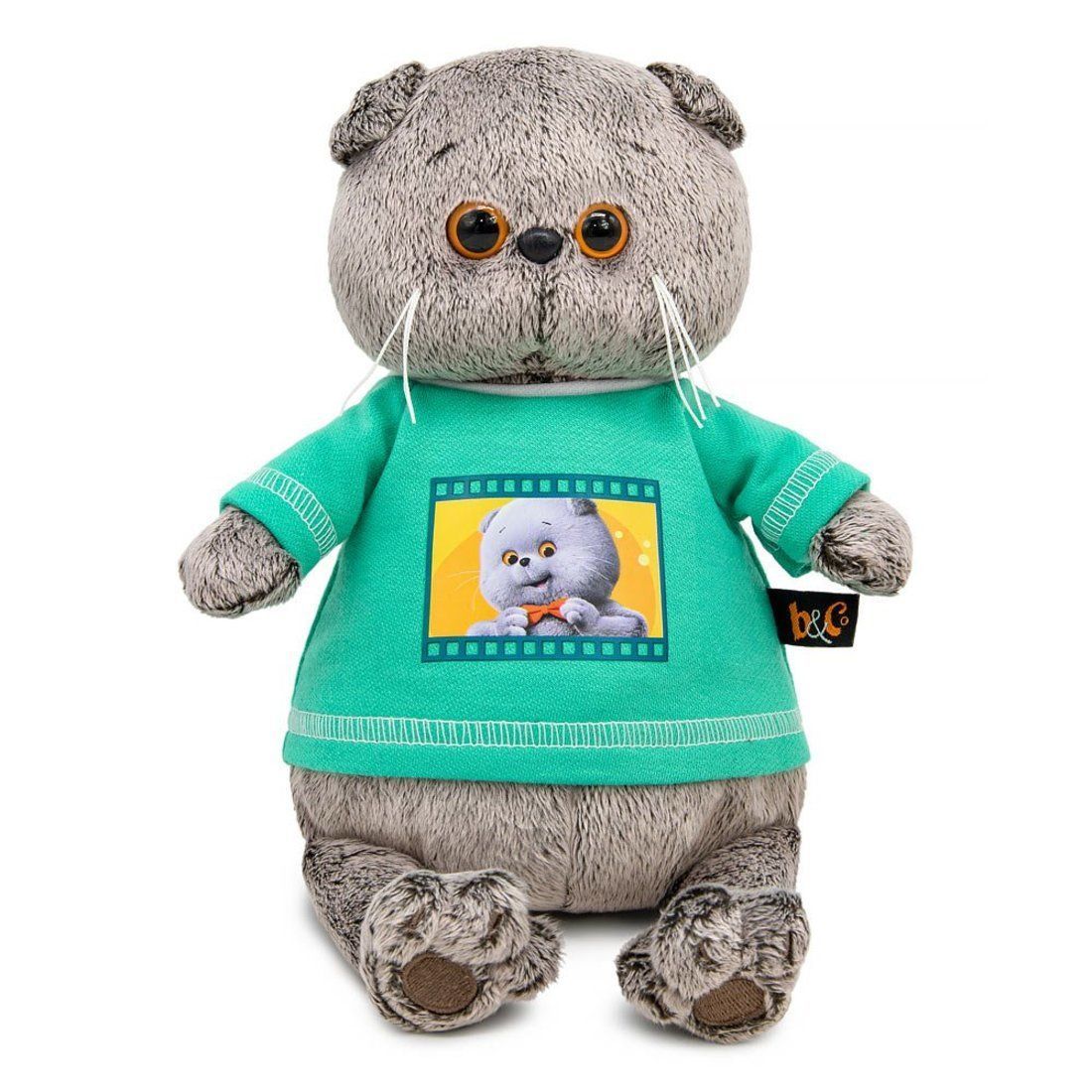 На Басике трикотажный лонгслив бирюзового цвета с принтом кадра из мультсериала. Кот представлен в фирменной коробке с дизайном в стиле мультсериала «Кот Басик