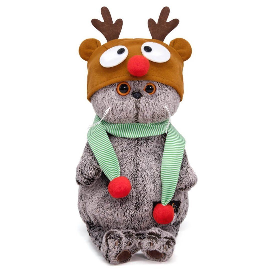 Басик в очень милой шапочке, сшитой в виде рождественского оленя. В комплекте с шапочкой мягкий трикотажный шарфик в тонкую бело‑зеленую полоску с алыми помпонами на концах. Игрушка поставляется в закрытой подарочной коробке, подвязанной атласными лентами.