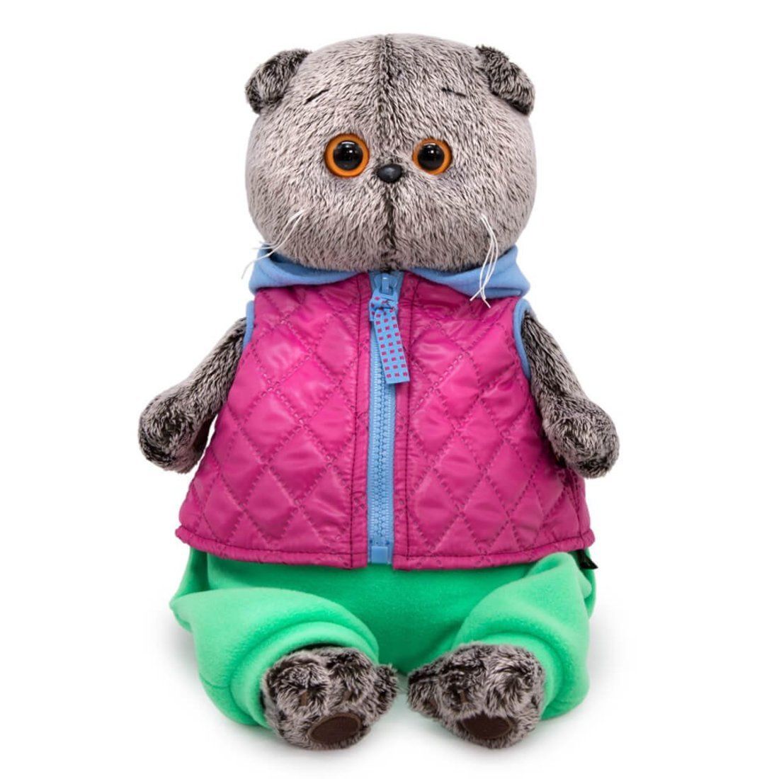 Кот Басик в супермодном стеганом жилете из болоньи цвета весенней фрезии. Жилет сшит с капюшоном из голубого софта, спереди жилет застегивается на голубую молнию в тон капюшона. В комплекте мягкие штанишки, по низу на манжетах. Штанишки сшиты из тепленького софта нефритового цвета. Игрушка поставляется в закрытой подарочной коробке, подвязанной атласными лентами.