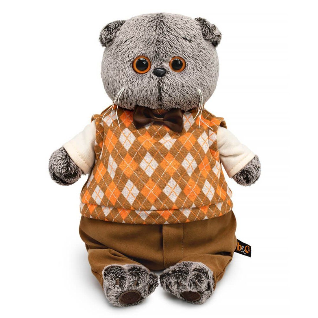 Кот Басик в супермодном жилете из жаккардового трикотажа в ромбик. Также на Басике штанишки из бархатистой плотной ткани цвета горчичного мёда и лонгслив из х/б трикотажа молочного цвета. На шее у Басика атласный галстук‑бабочка шоколадного цвета.