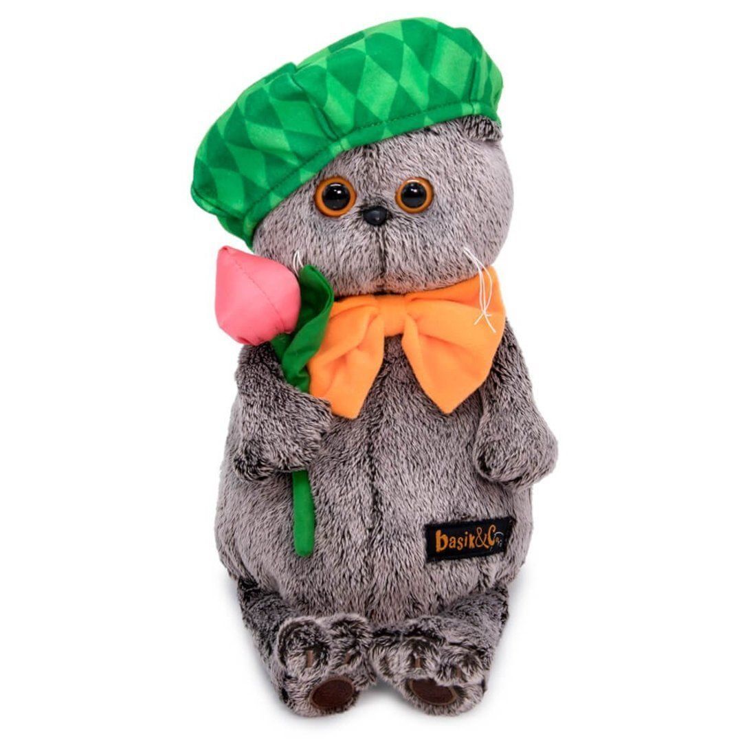 Милый котик Басик понравится и мальчику, и девочке! Этот очаровательный малыш очень коммуникабельный: он просто обожает, когда с ним играют и берут его с собой в гости, любит ласку, любовь и внимание. У котика мягкая, приятная на ощупь шёрстка роскошного дымчато-серого цвета. Басик одет в яркий комплект. Шикарный берет из софта с принтом, объемный бант цвета апельсиновой кожуры, а в лапках нежный тюльпан, выполненный вручную. Игрушка поставляется в закрытой подарочной коробке, подвязанной атласными лентами.