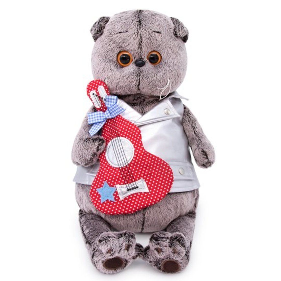 Басик в рокерском жилете из серебристой эко‑кожи на клепках. В лапках кот держит забавную гитару, выполненную вручную и украшенную бантиком в клеточку. Игрушка поставляется в закрытой подарочной коробке, подвязанной атласными лентами.