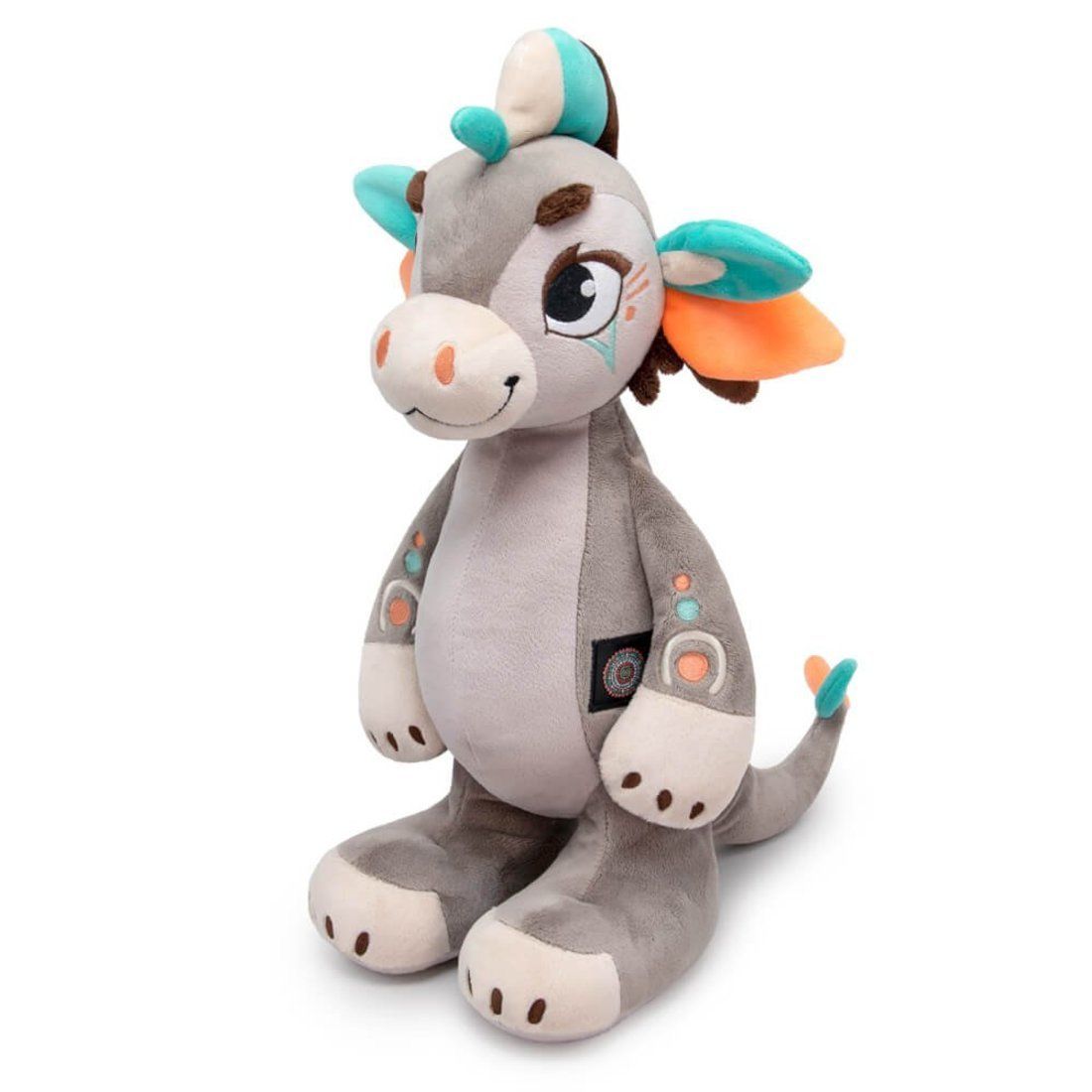 Дракон Эйлев сшит из нежного софта в дымчато‑молочных оттенках с яркими деталями и вышивкой.