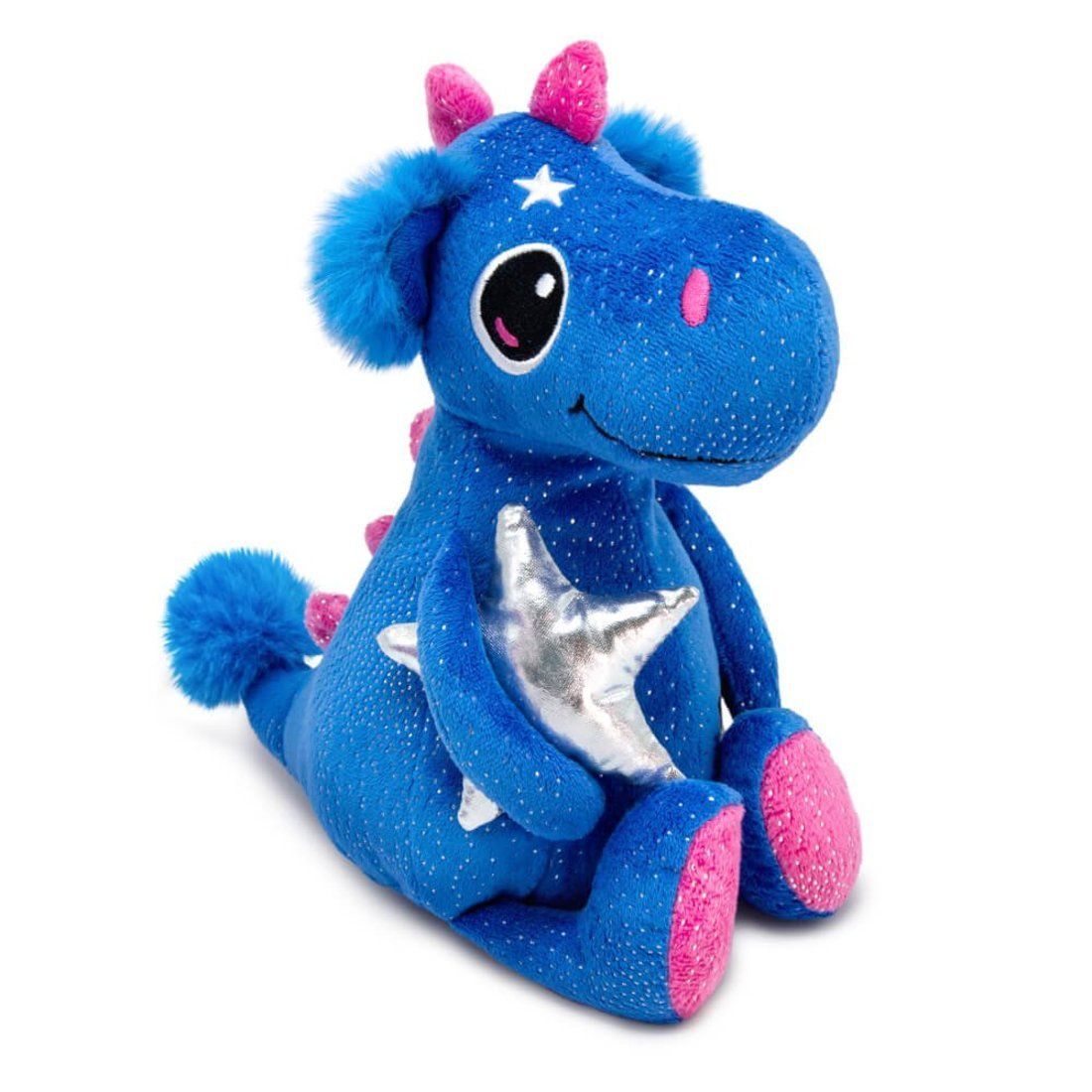 Сияющего синего цвета с серебристыми вкраплениями дракончик Ольсэн держит в лапках звезду из плотной серебряной ткани.