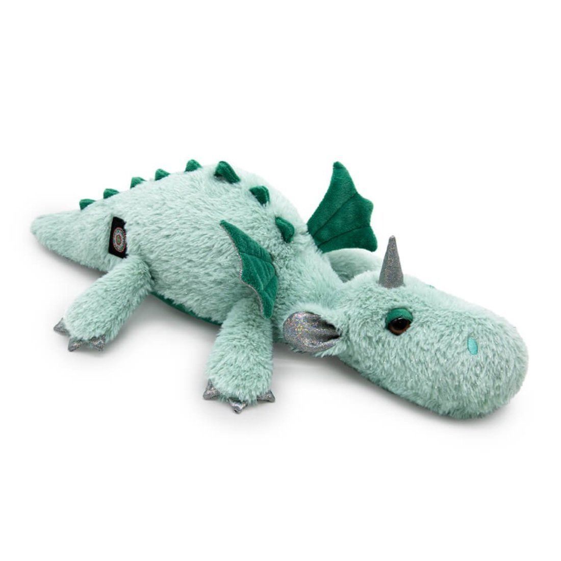 Лежачий дракончик Сив сшит из мятного меха с серебристым блеском, с серебряными вставками, а также изумрудного софта.