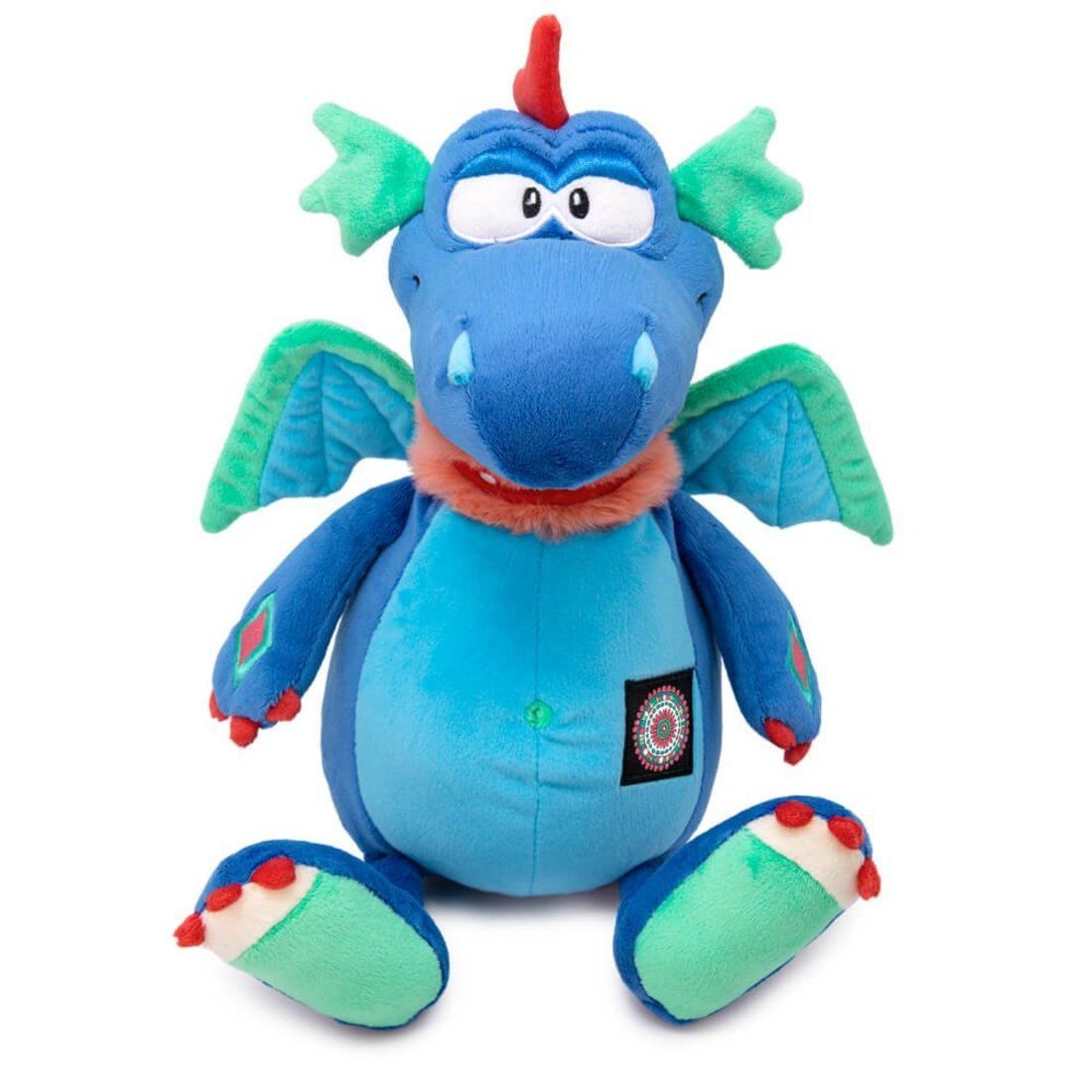 Шикарный дракон Зигмунд с выразительными глазами, сшит из синего, голубого, бирюзового и алого софта. На шее у Зигмунда мягкий ошейник, подбитый коралловым мехом.
