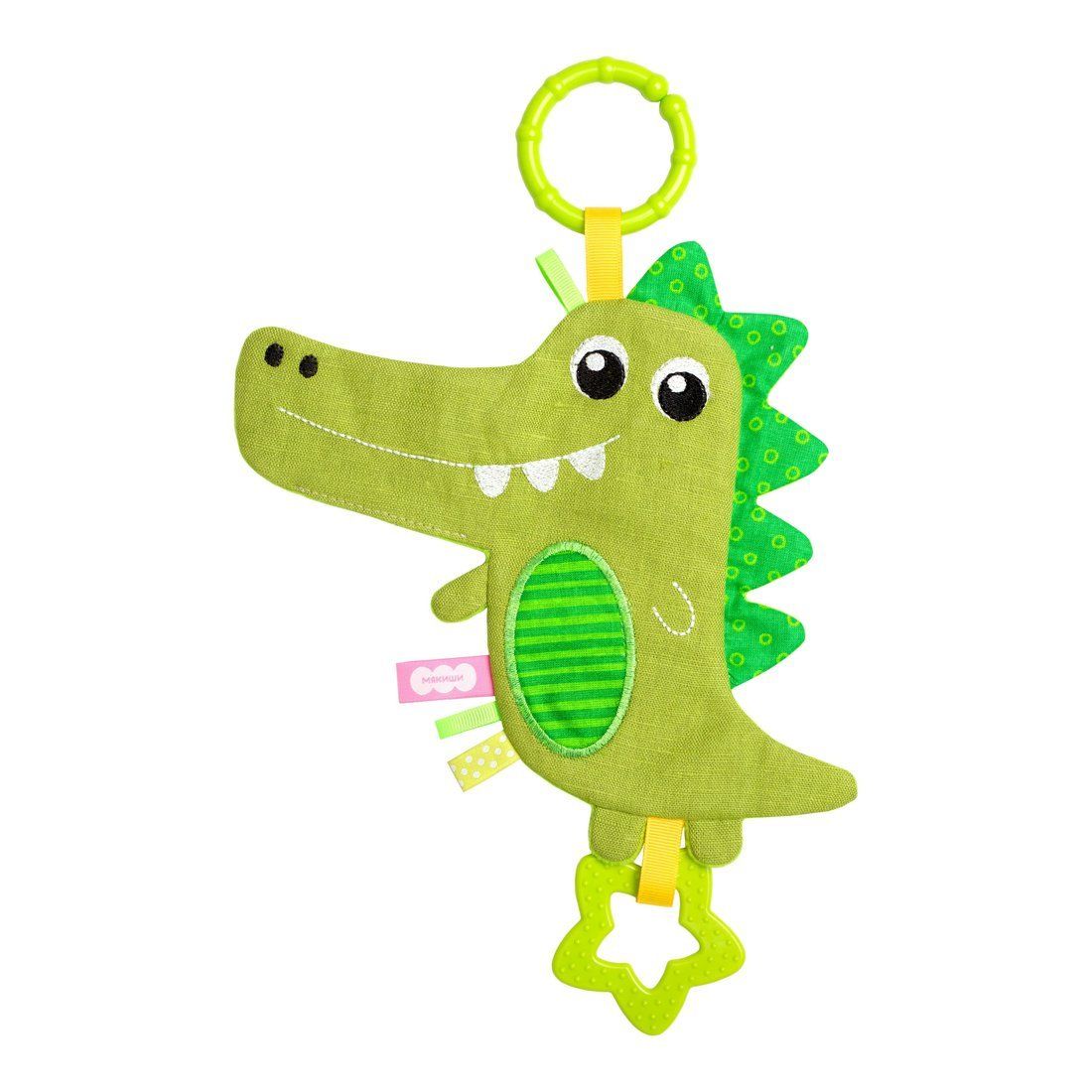 Подвеска «Хрустящий Крокодильчик» подарит малышу множество приятных и запоминающихся моментов. Благодаря колечку-держателю и компактному размеру погремушки, ее удобно брать с собой в дорогу и без труда крепить на автокресло или коляску. Внутри забавной погремушки для новорожденных находится шуршалка, которая развеселит малыша и вызовет неподдельный восторг. Игровой процесс способствует развитию зрения, слуха и мелкой моторики, что особенно важно детям до года. Грызунок-прорезыватель в форме звездочки облегчит боль в деснах при прорезывании зубов и сделает неприятный процесс менее заметным для самых маленьких. Погремушка для малыша до года выполнена из гипоаллергенных материалов: натурального экологически чистого льна и трикотажа. Подвеска станет приятным и актуальным подарком для новорожденного на рождение, выписку, крестины, и другие значимые даты. Сделано в России.