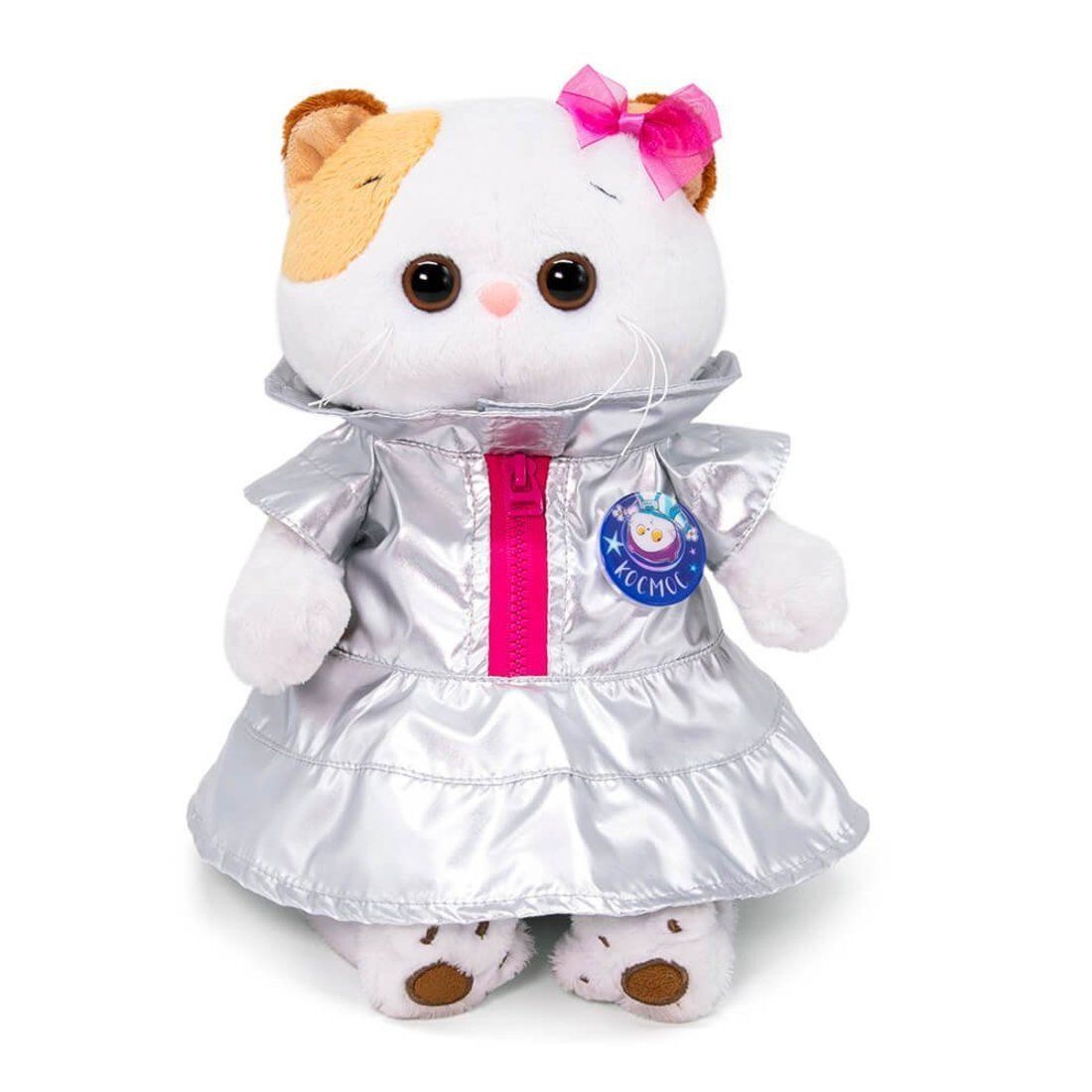 Ли‑Ли в необычном платье из коллекции «Космос». Кошечка будто собралась на парад планет в платье из болоньи металлик с высоким воротником, юбочкой из двух полос и яркой молнией по переду. На ушке малиновый бантик из органзы, а на груди прикреплен фирменный значок с логотипом коллекции «Космос». Игрушка поставляется в закрытой подарочной коробке, подвязанной атласными лентами.