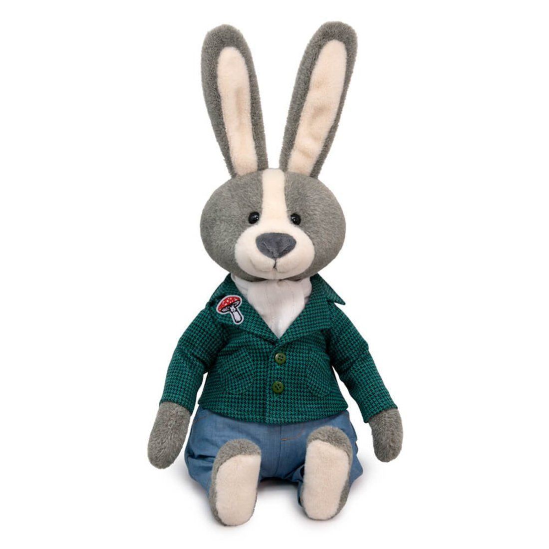 Кролик Пако в невероятно уютном пиджачке из изумрудного плотного трикотажа в мелкую клеточку и широких штанишках из голубой джинсы с оранжевой строчкой. На лацкане пиджачка маленькая нашивка в виде яркого грибочка. В комплекте белый шейный платок из тонкого хлопка.