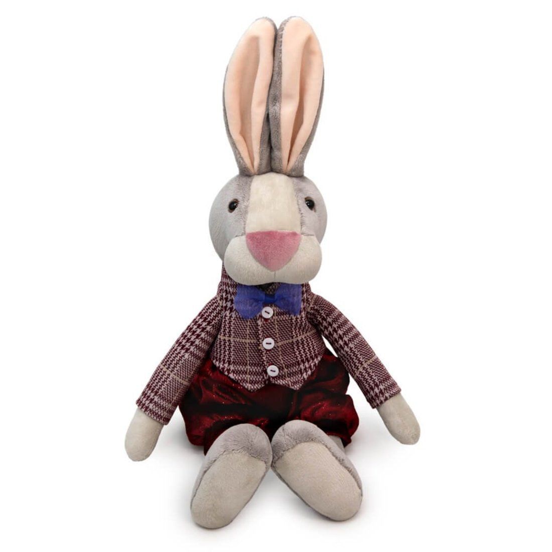 Кролик Вульф в шикарном комплекте. Бархатные штанишки цвета темной вишни и фрак из плотного трикотажа в клетку. А также галстук‑бабочка из органзы лавандового цвета.