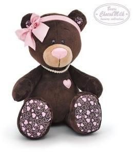Мишка-девочка Choco Milk - очаровательная мягкая игрушка с атласной ленточкой на голове и жемчужной ниточкой на шее. Прелестная медведица обожает находиться в центре внимания и привлекать взгляды, что, впрочем, у неё получается без труда. У мишки очень мягкая и приятная на ощупь шёрстка тёмно-коричневого цвета, а на ножках у неё оформлен принт в виде множества сердечек.