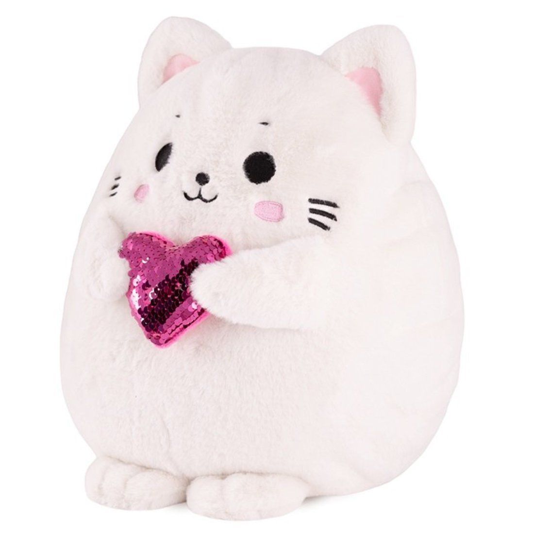 У пушистого котика в лапках сверкающее сердечко. Оно проявляет чувства мягкой игрушки: большое счастье, что беленькой подушке из экологичного и мягкого волокна, которая подходит под любой интерьер, не придётся больше оставаться наедине с собой по ночам. Теперь котик сможет спать, не беспокоясь, около хозяина и наглядно показывать, как он его любит. И само по себе сердечко красивое, блестящее и привлекательное.
