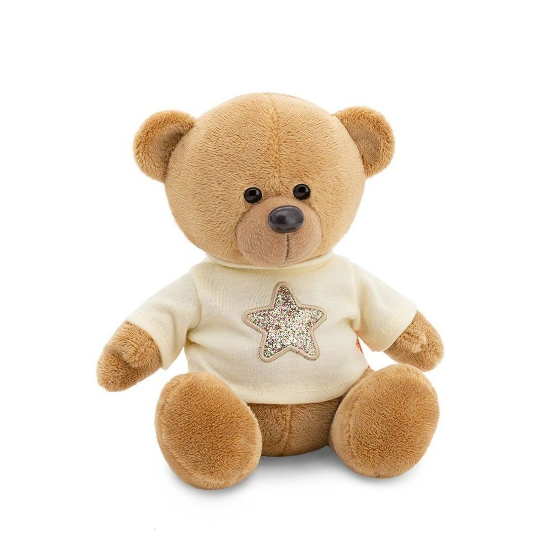 Познакомьтесь – это Медведь Топтыжкин. Медвежонок обожает смотреть по вечерам на небо и мечтательно разглядывать звёзды! Да и сам он не прочь немного побыть звёздочкой, блистая своим модным стилем в компании друзей. Сегодня на Мишке – трикотажный джемпер кремового цвета с блестящей аппликацией. Кажется, кое-кто сияет ярче, чем звёзды на небе!