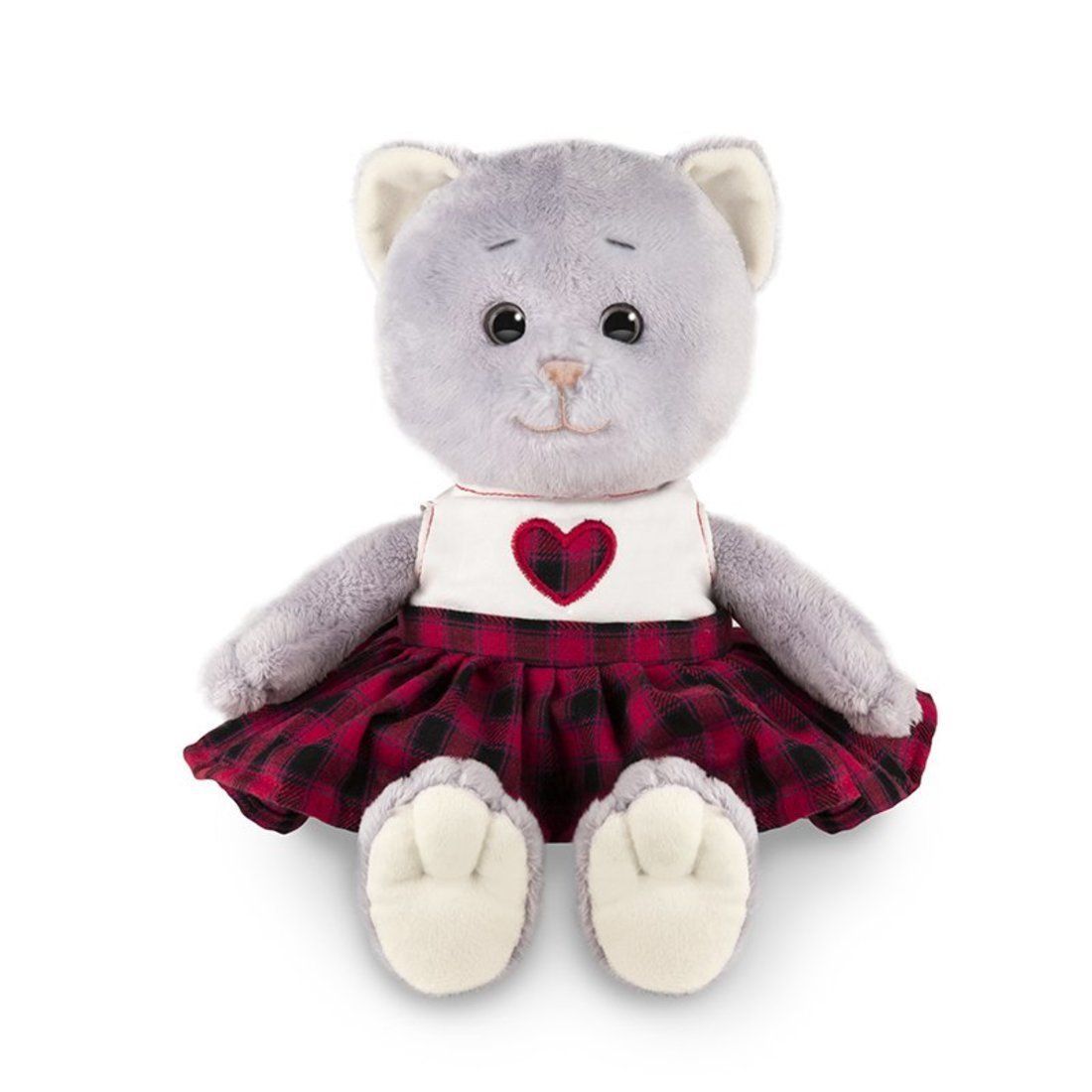 "Знакомьтесь: Мышель – милая школьница! Она стала совсем взрослой и пошла в первый класс! Теперь Мышель учит кошачью азбуку, мурлыкает таблицу умножения, а на переменках щебечет с другими кошечками. Больше всего ей приглянулась новая форма с клетчатой юбкой. Нашей кошечке так нравится учиться и каждый день узнавать новое, что на маечке она сделала аппликацию из сердца под цвет юбке. Отличный подарок для любознательных девочек! Игрушка идет в стильной подарочной коробке."