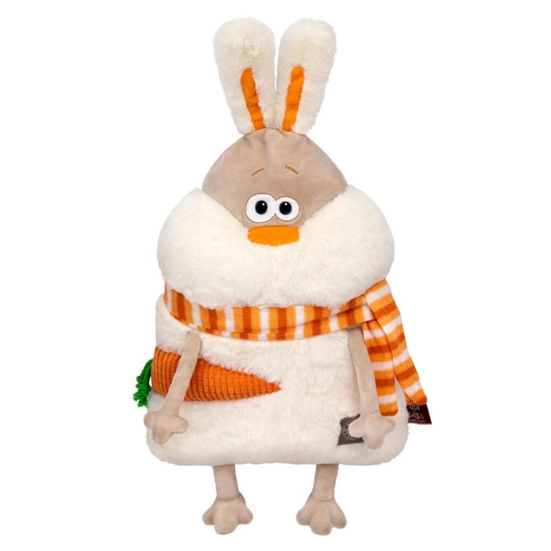Необыкновенно уютный заяц-подушка Роджер, сшит из мягчайшего софта. На животике выполненная аппликацией морковка, а на шейке полосатый шарфик из трикотажа.