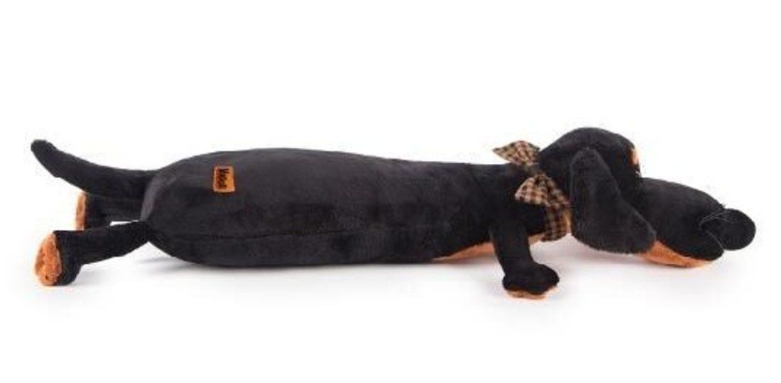 Пёс-подушка с галстуком-бабочка из ткани в клеточку коричневых оттенков.