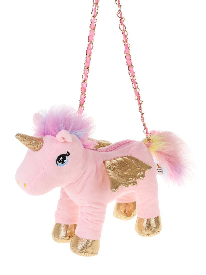 Эта чудесная сумочка от ТМ Fluffy Family выполнена в виде очаровательной единорожки. Аксессуар будет не только удобным средством переноски нужных мелочей, но и прелестным акцентом в образе девочки. Единорожка выполнена в нежно-розовом цвете, у неё золотистые копытца, крылышки и рог, голубые глазки и радужная грива и хвостик. Молния, открывающая доступ к внутреннему отделению, расположена на спинке игрушечного котика. Аксессуар снабжен ремешком-цепочкой.