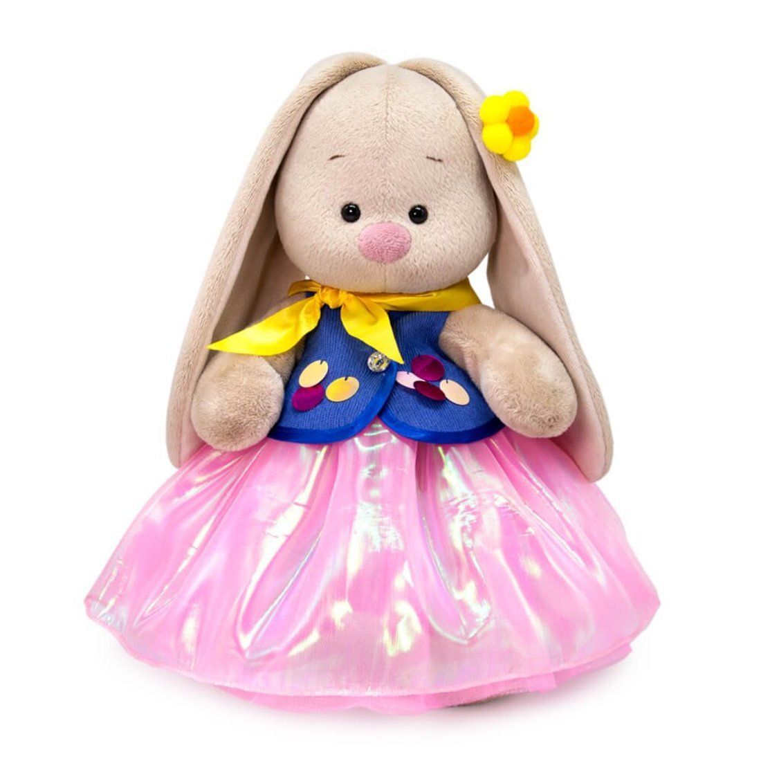 На Зайке шикарный костюм. Пышная юбка цвета розового сахара из тонкой ткани с отливом. Модный жилетик из микровельвета красивого цвета морской глубины. Жилетик отделан бейкой и украшен крупными пайетками. В комплекте шейный платочек из лимонного шелковистого сатина. На ушке у Зайки объемный цветок, выполненный из маленьких помпонов.