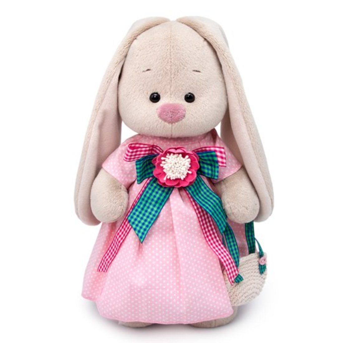 Чудесная Зайка Ми очарует ребёнка с первого взгляда! Зайка в лёгком нежно-розовом платьице в мелкий горошек. Платье отрезное по талии с пышной юбочкой на подкладе из розовой сеточки. Спереди платье украшает аксессуар ручной работы – яркая камелия с бантами в клеточку. В комплекте – вязаная крючком сумочка из х/б ниток натурального цвета. Сумочка с ручками из лент с креплением на розовые пуговки. Игрушка поставляется в подарочной упаковке.