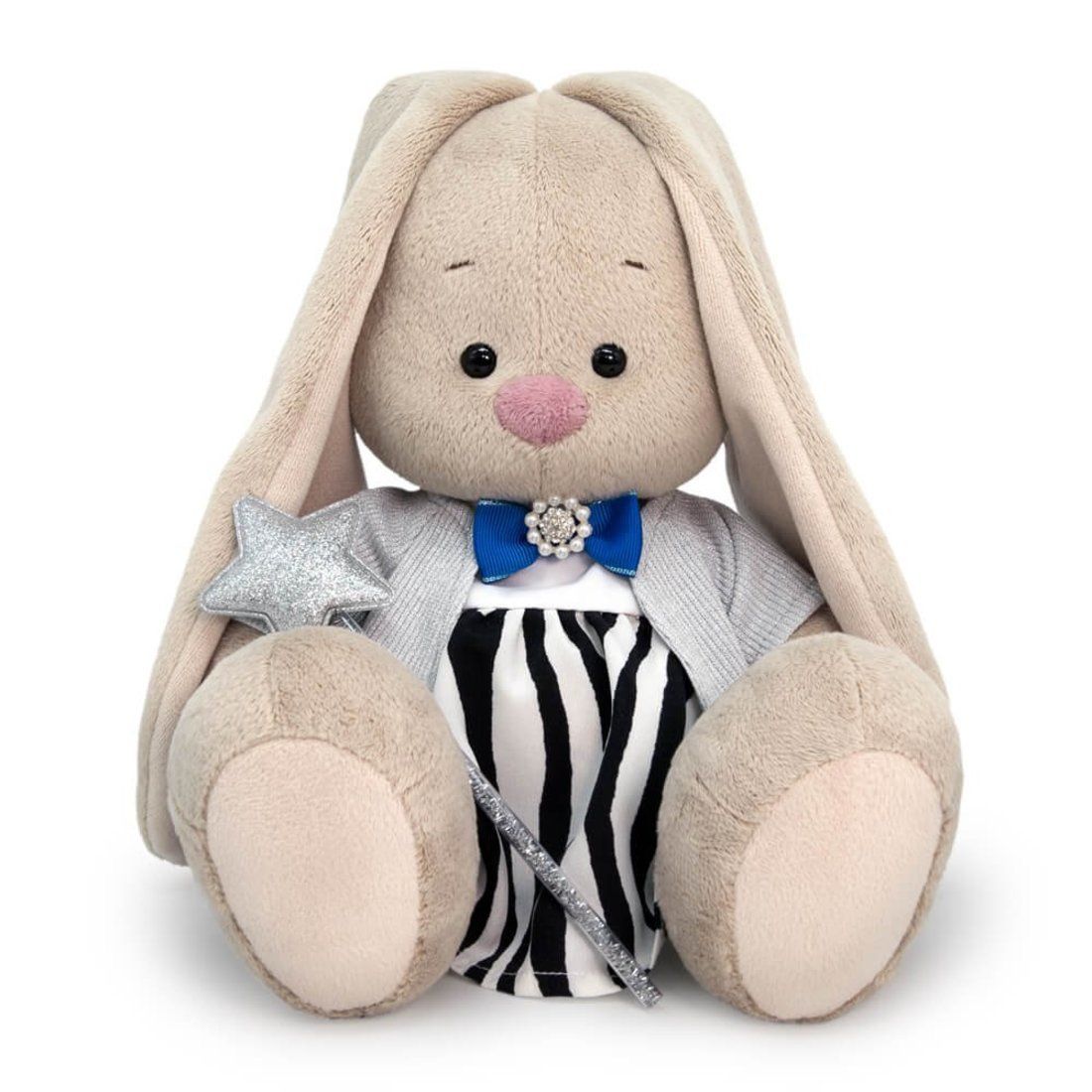 На Зайке Ми шикарный костюмчик волшебницы. Сарафанчик из двух тканей‑компаньонов, белый верх и низ из черно‑белой ткани с анималистическим принтом. Поверх сарафана болеро из очень модного серебристого трикотажа с люрексом. На шейке у Зайки необыкновенный бант, выполненный из синей сутажной ленты с серебристым краем. В середине банта богатая брошь, усыпанная жемчужинами и стразами. А в лапках Зайка держит необычный серебристый аксессуар — волшебную звёздочку на палочке. Игрушка поставляется в открытой коробке.