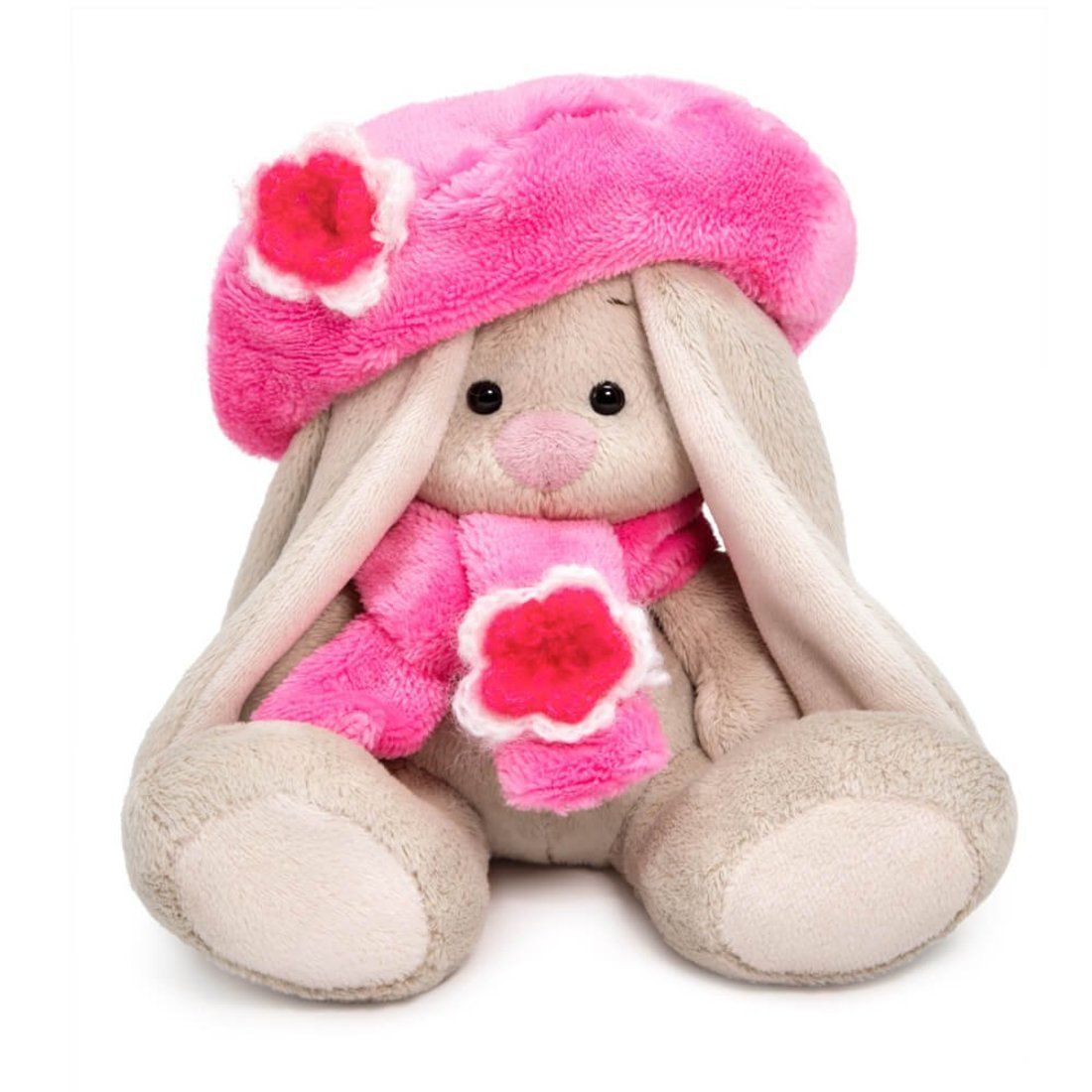 Малышка Зайка в милом теплом комплекте. Объемный берет и шарфик из ворсистого софта цвета розовой карамели. И на берете, и на шарфике украшение из связанных вручную цветочков. Игрушка поставляется в открытой коробке.
