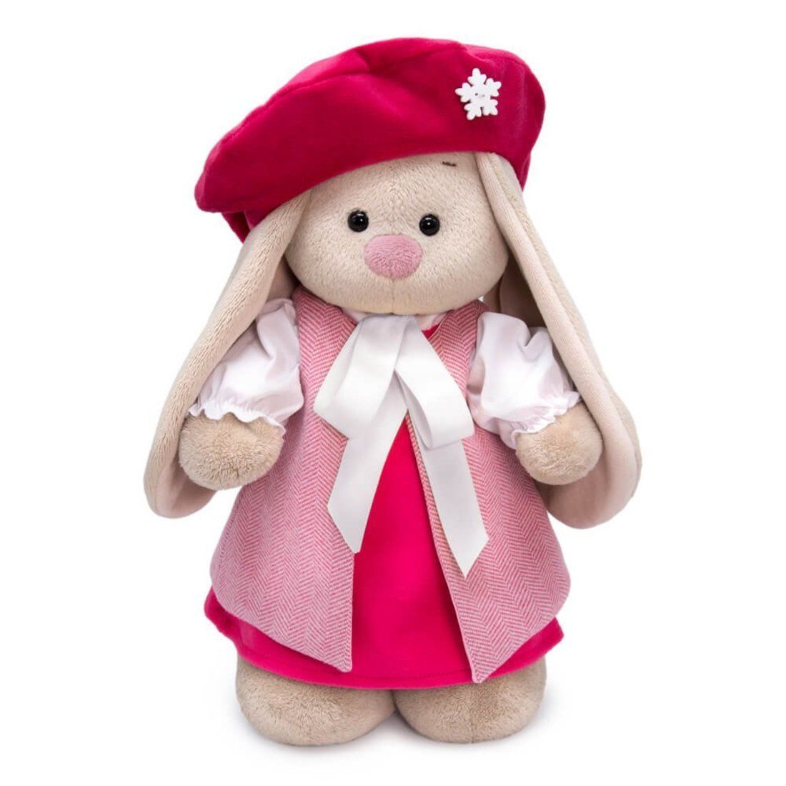 На Зайке Ми — очень красивый и нарядный комплект. Платье из софта цвета спелой малины с белоснежными рукавами из хлопка со сборкой. Спереди платье украшено атласным бантом. Поверх платья жилет из твида в елочку. Также на Зайке объемный мягкий берет с маленькой снежинкой. Игрушка поставляется в оригинальной подарочной упаковке.